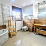 • Wyposażenie: kuchnia w pełni umeblowana, wyposażona w nowoczesny sprzęt AGD, toaleta na parterze z umywalką, łazienka na piętrze z wanną, prysznicem, toaletą oraz umywalką