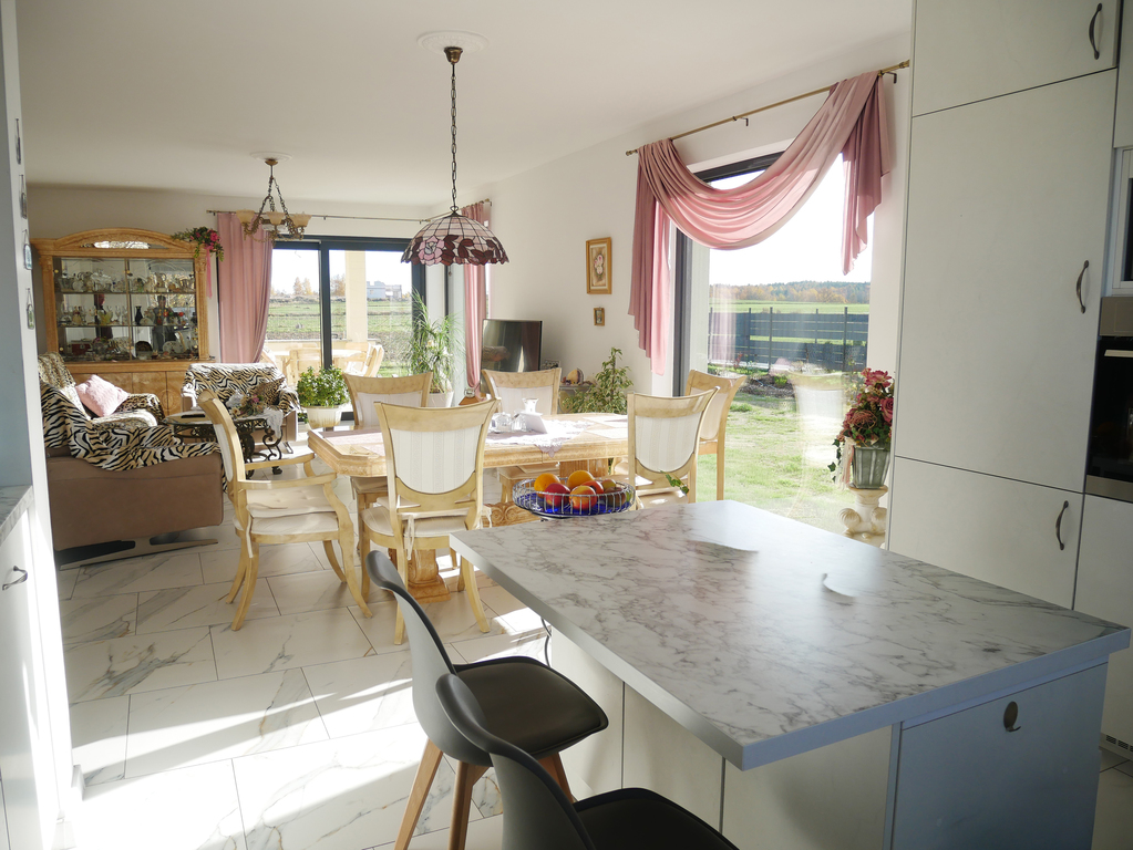 - przestronny salon połączony z jadalnią, znajduje się obok kuchni, posiada również piękne, duże przeszklenia prowadzące na taras