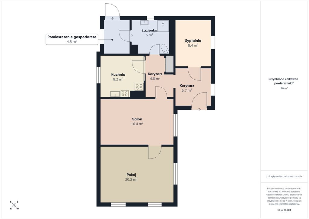 Budynek parterowy o funkcjonalnym układzie: salon 16,4 m², pokój 20,3 m², sypialnia 8,4 m², kuchnia 8,2 m², łazienka 6 m² oraz pomieszczenie gospodarcze 4,5 m². Układ zapewnia wygodne użytkowanie i możliwość adaptacji.