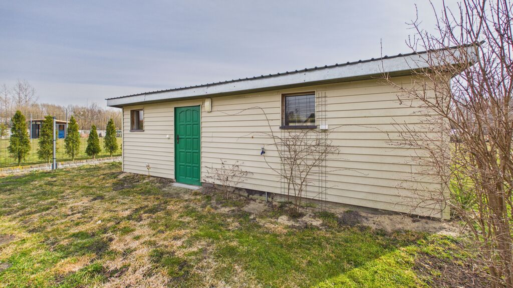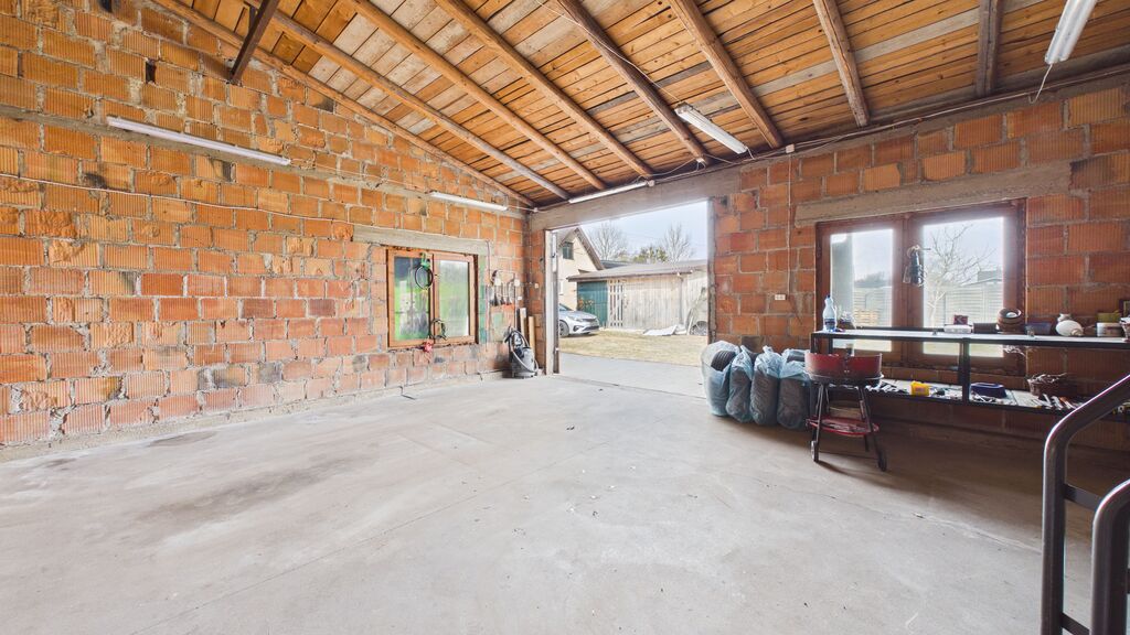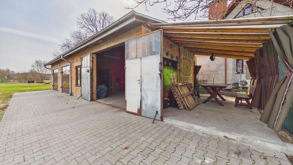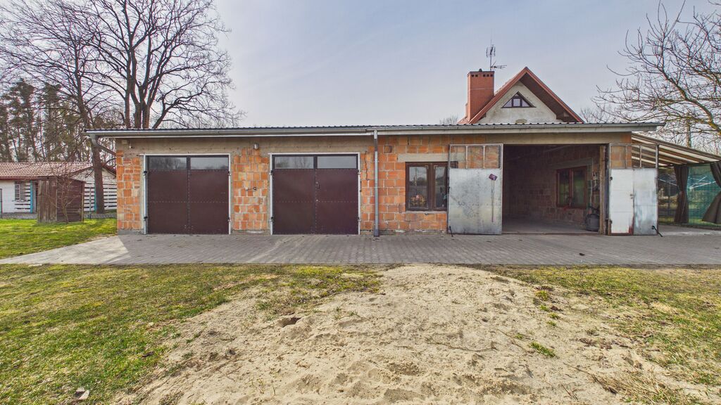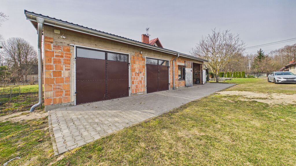 Na działce znajduje się garaż ok. 90 m² (3 stanowiska), wcześniej wykorzystywany jako warsztat mechaniczny, oraz oddzielny budynek w głębi działki – letnia kuchnia.