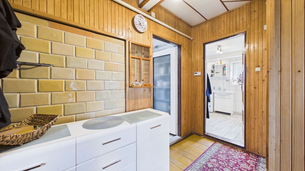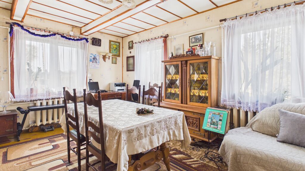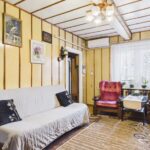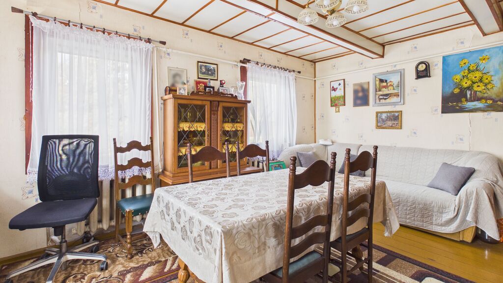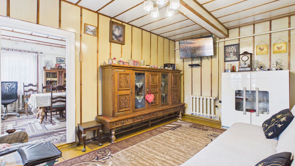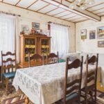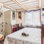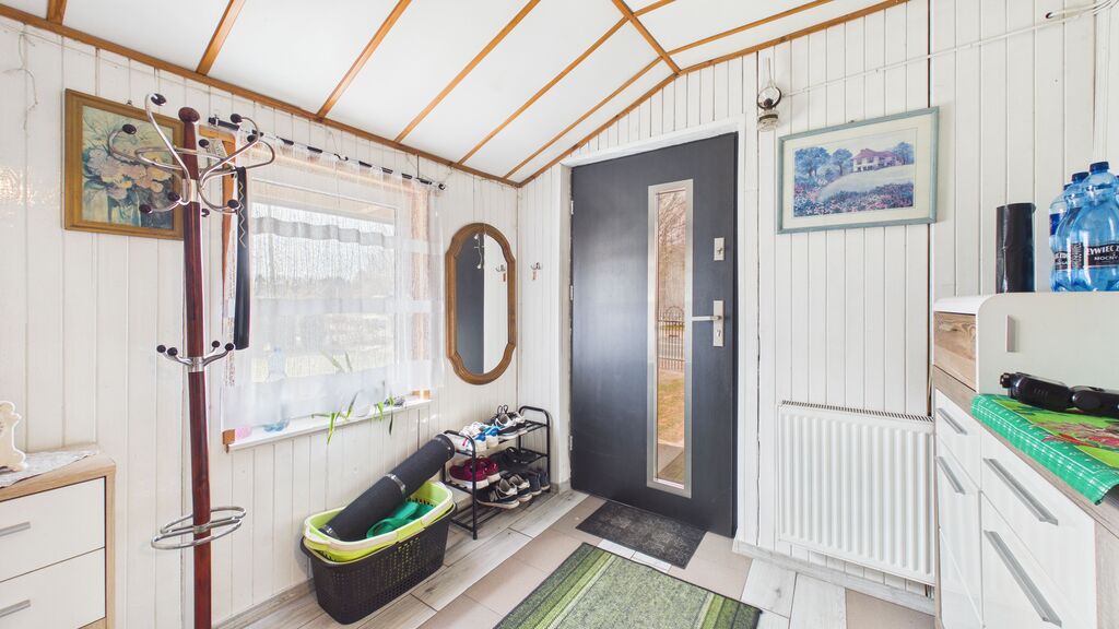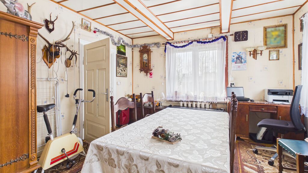 Wnętrza utrzymane w stylu tradycyjnym, z widocznymi elementami drewnianymi i klasycznym umeblowaniem. W pokojach znajdują się drewniane podłogi oraz panele, ściany w jasnych kolorach z dodatkiem tapet. Kuchnia wyposażona w zabudowę w stylu klasycznym oraz kuchnię kaflową, co podkreśla charakter domu. Łazienka wykończona w glazurze i terakocie, w pełni funkcjonalna. Pomieszczenia są zadbane i nadają się do zamieszkania, z możliwością modernizacji według własnych preferencji.