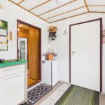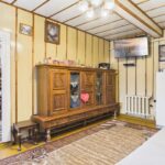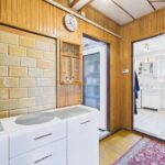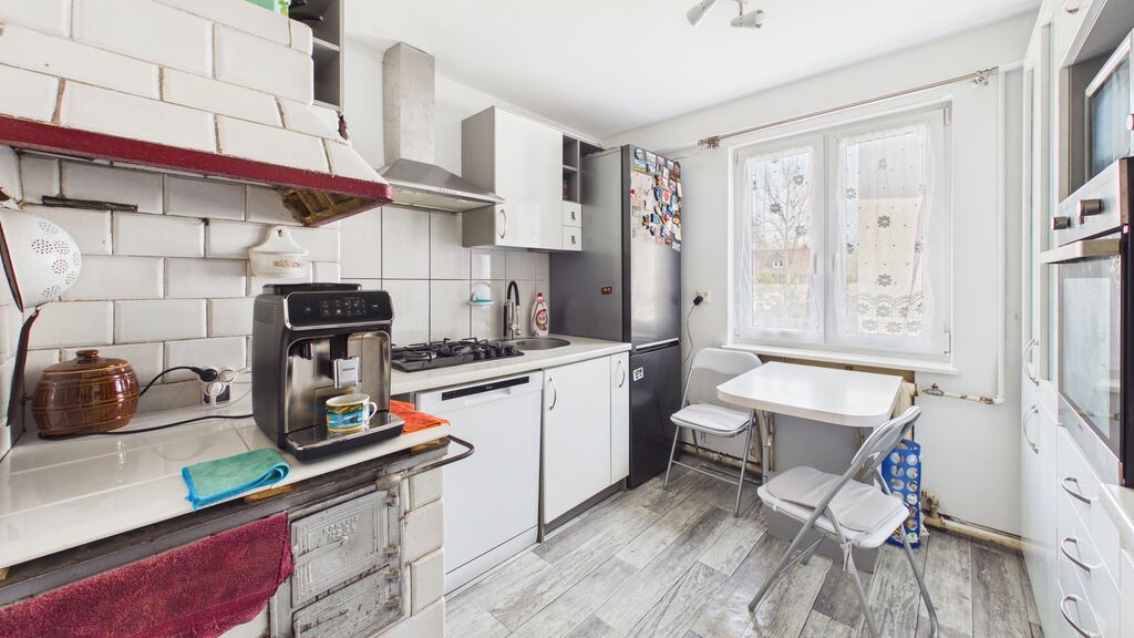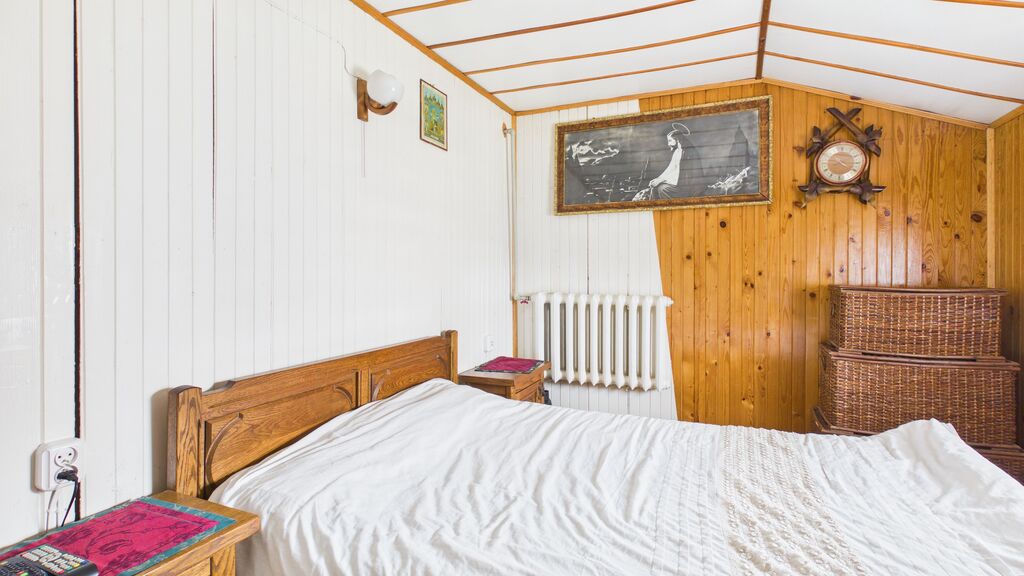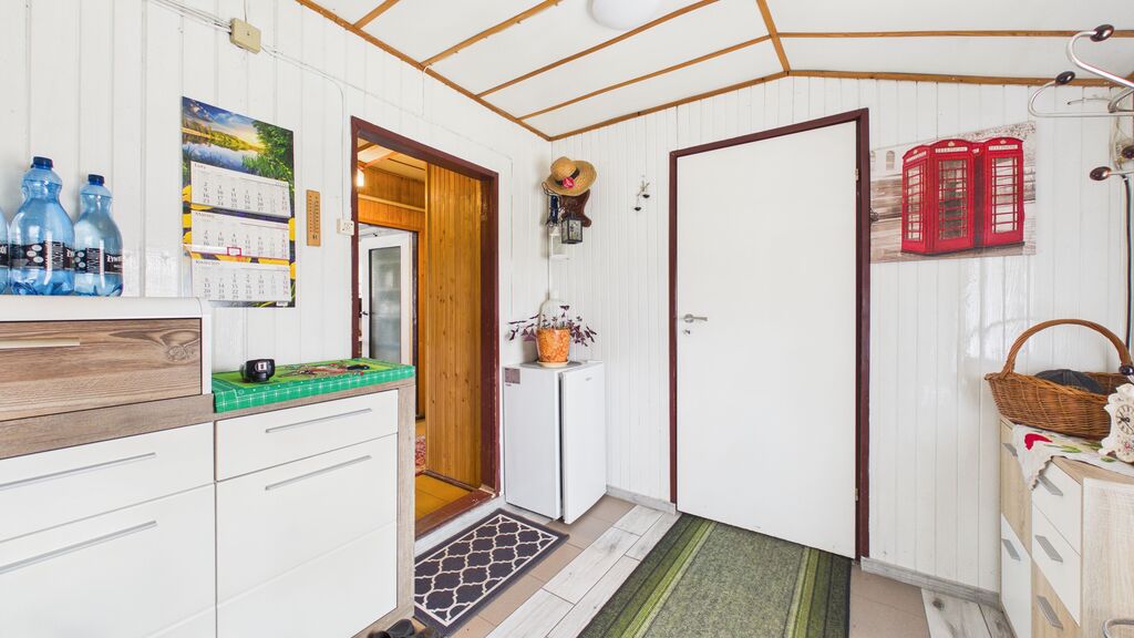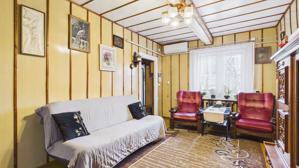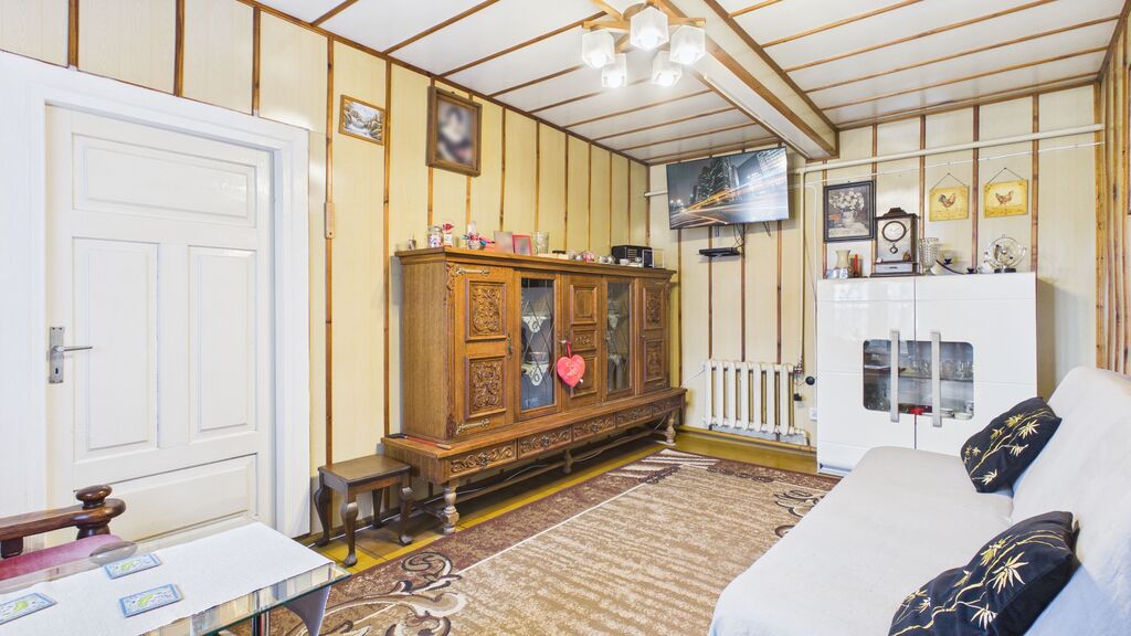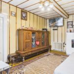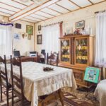 Wnętrza utrzymane w stylu tradycyjnym, z widocznymi elementami drewnianymi i klasycznym umeblowaniem. W pokojach znajdują się drewniane podłogi oraz panele, ściany w jasnych kolorach z dodatkiem tapet. Kuchnia wyposażona w zabudowę w stylu klasycznym oraz kuchnię kaflową, co podkreśla charakter domu. Łazienka wykończona w glazurze i terakocie, w pełni funkcjonalna. Pomieszczenia są zadbane i nadają się do zamieszkania, z możliwością modernizacji według własnych preferencji.