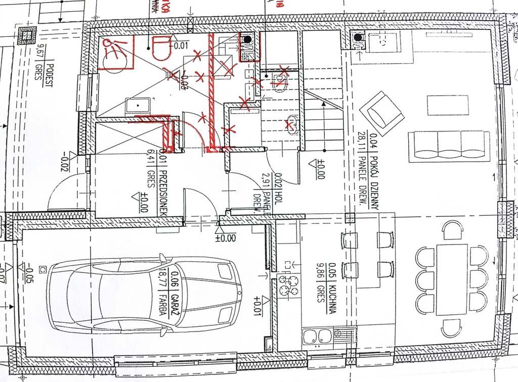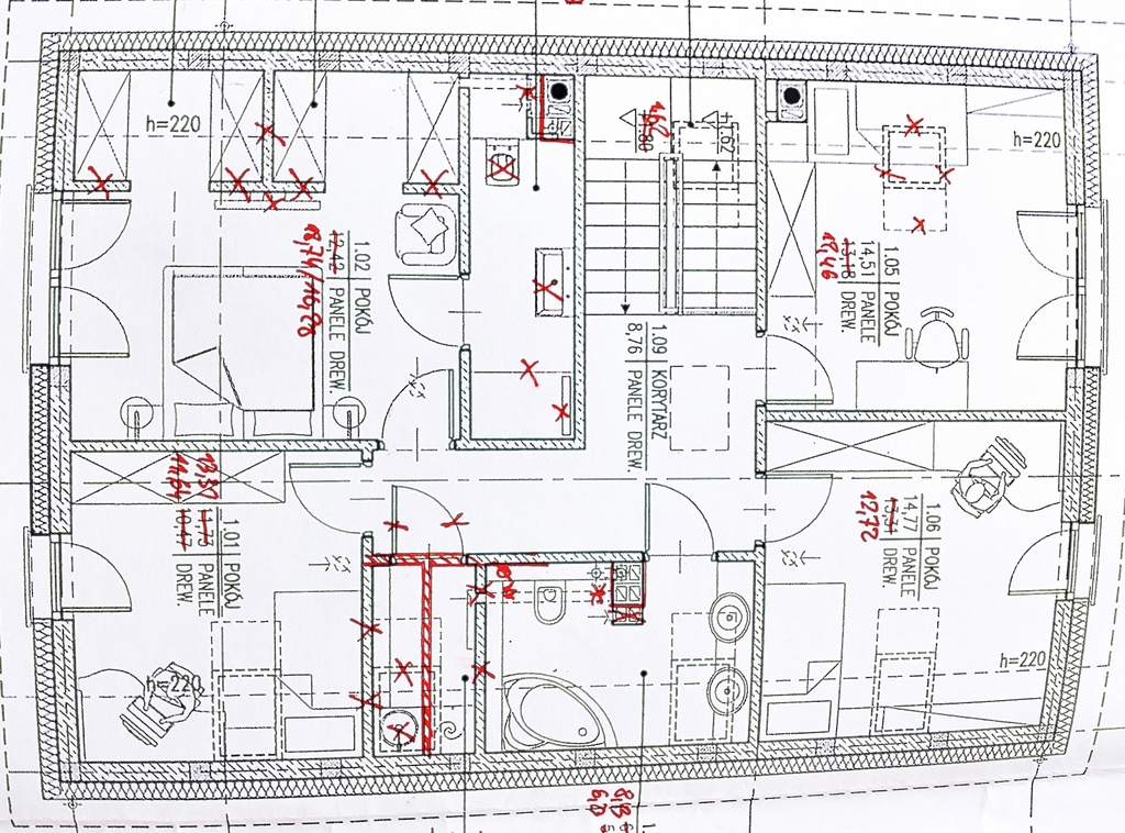 - podłoga: wylewka betonowa, izolacja posadzki na parterze styropian 15 cm, ogrzewanie podłogowe na obu poziomach,