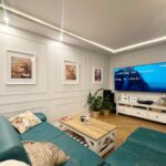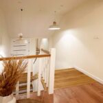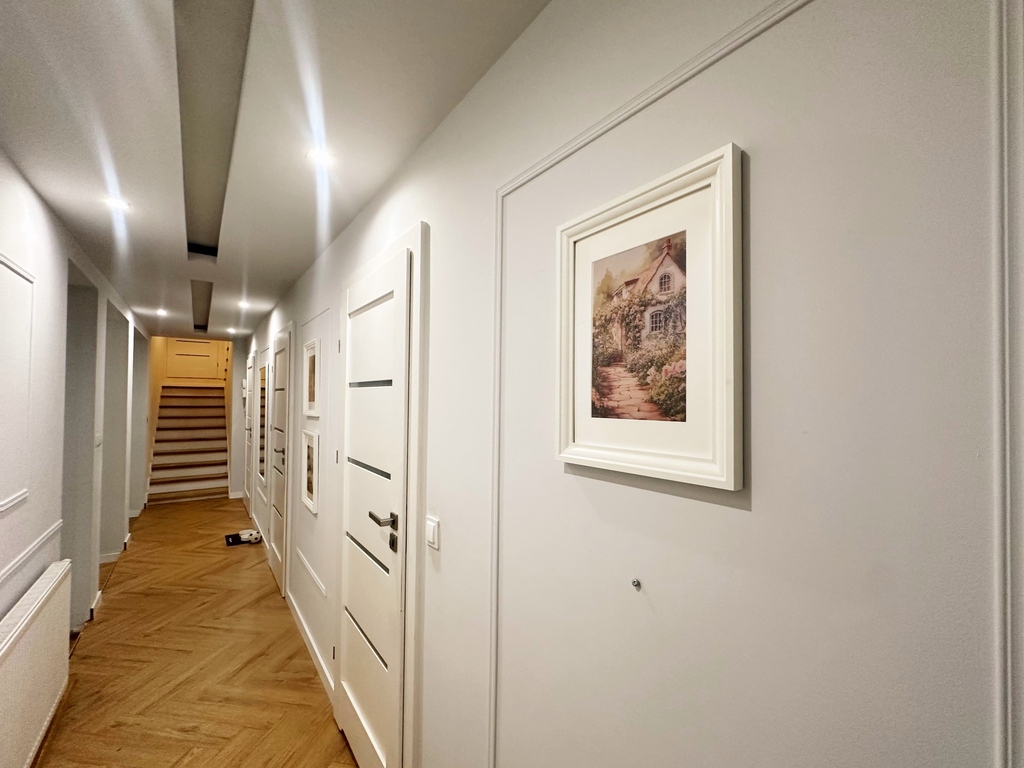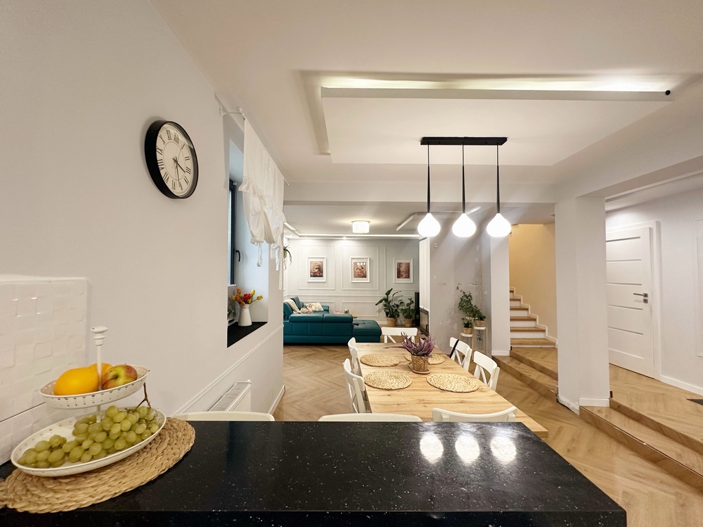 Urządzony w neutralnym, ciepłym klimacie, z przewagą bieli, beżu oraz drewna, dodatkowo w salonie znajduje się dodający uroku kominek. To styl, który nie przemija.