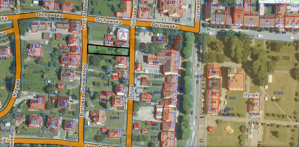 Nieruchomość położona jest w ścisłym centrum Nowego Wiśnicza, przy ul. Długiej 3, w zabudowie szeregowej, z dojazdem z dwóch stron: od ul. Długiej oraz ul. Głowackiego.
