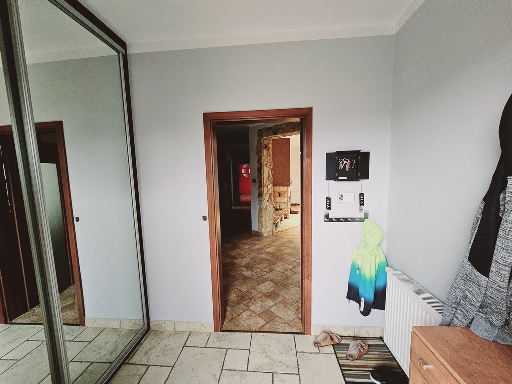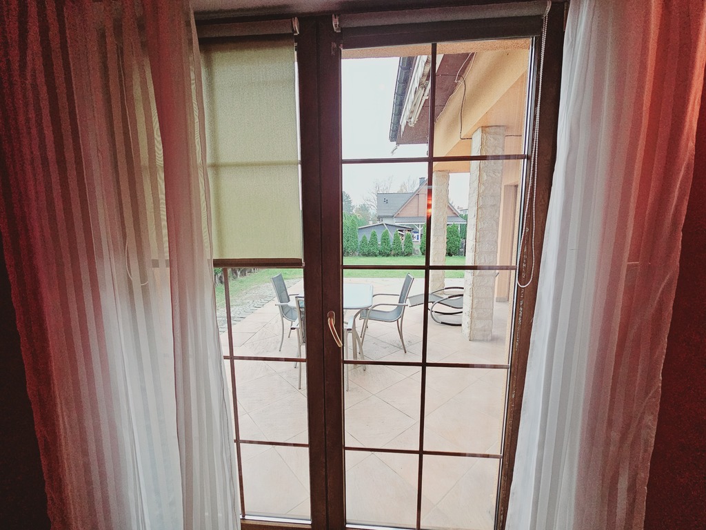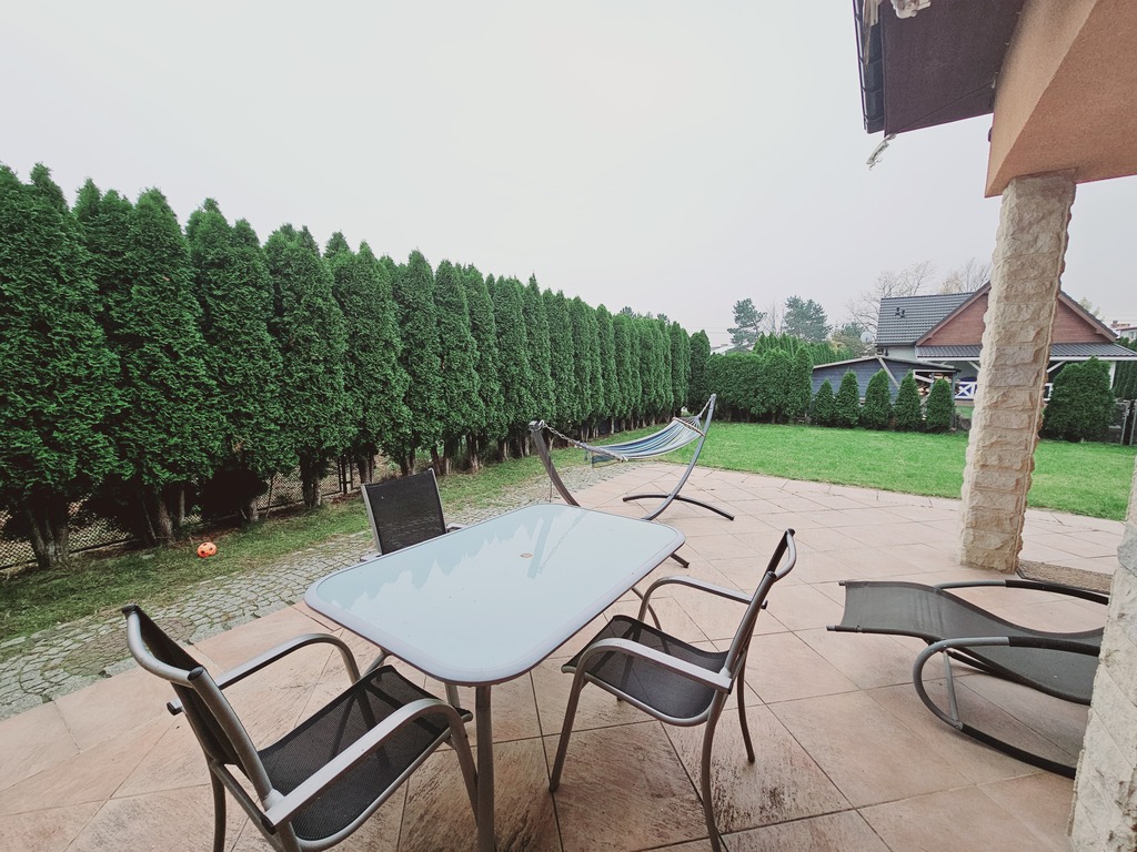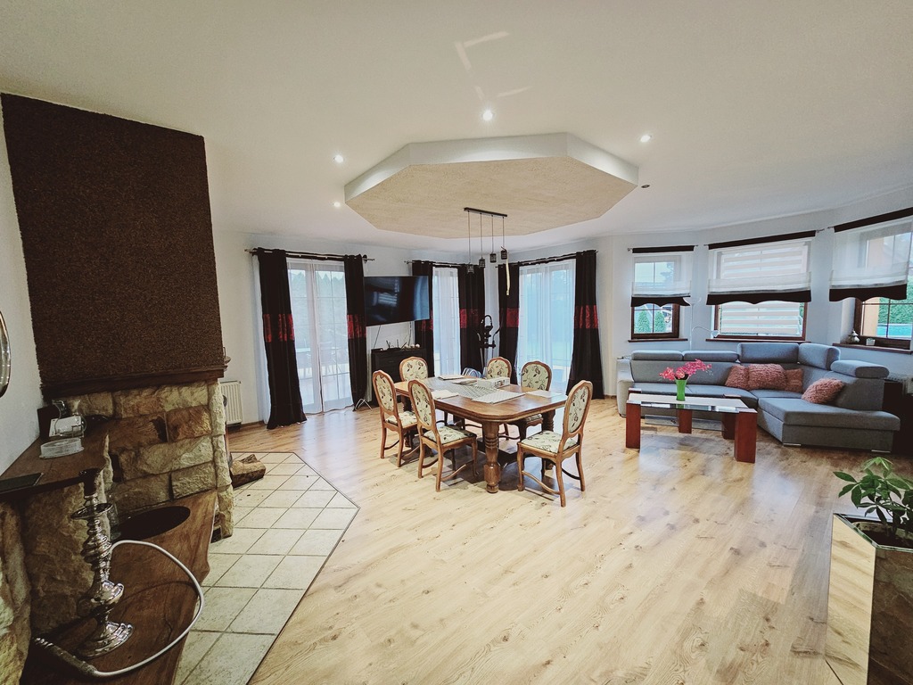 - Obszerny salon z kominkiem, jadalnią i wyjściem na taras