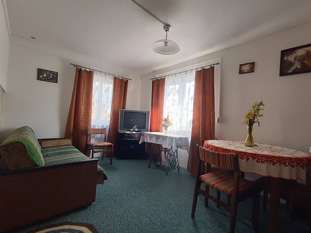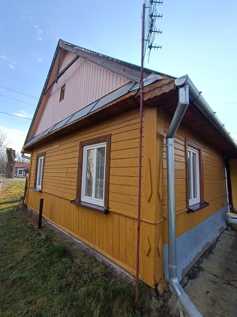 Dom drewniany z ogrzewaniem na piece Kaflowe, dach pokryty blachą trapezową, okna wymienione na PCV.
