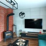 Na parterze jest duży wiatrołap z szafami wnękowymi, wieszaki oraz siedzisko dla wygody zmiany obuwia. Następnie wchodzimy do dużego salonu z aneksem kuchennym. Znajduje się w nim część jadalna oraz wypoczynkowa z wyjściem na taras. W salonie jest także kominek typu koza, który stylem dodaje uroku oraz efektywnie ogrzewa dom.