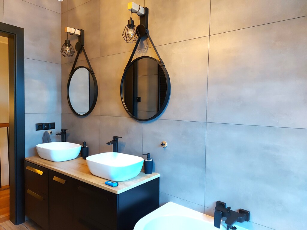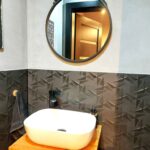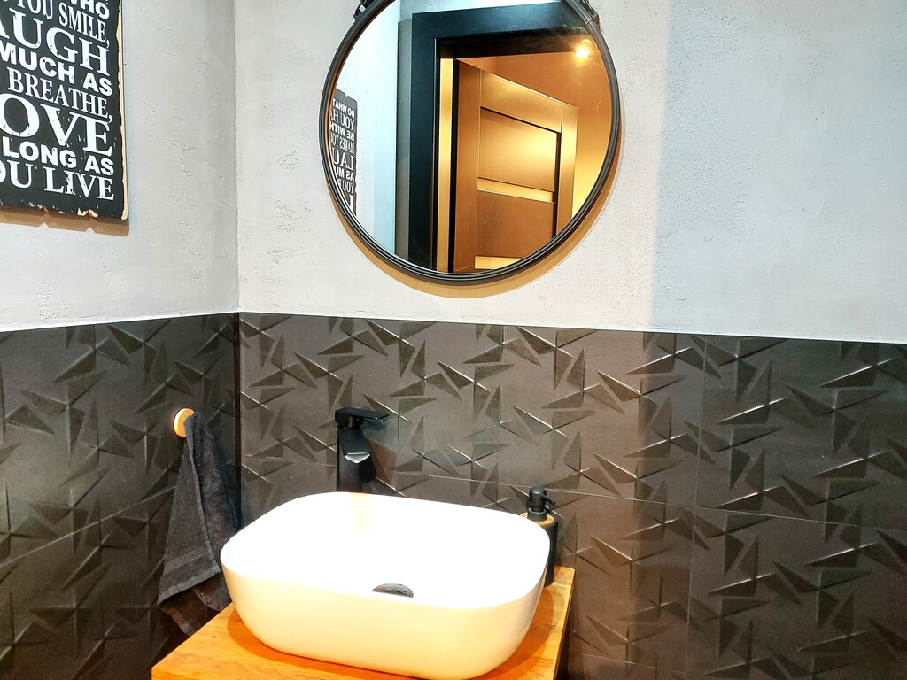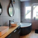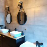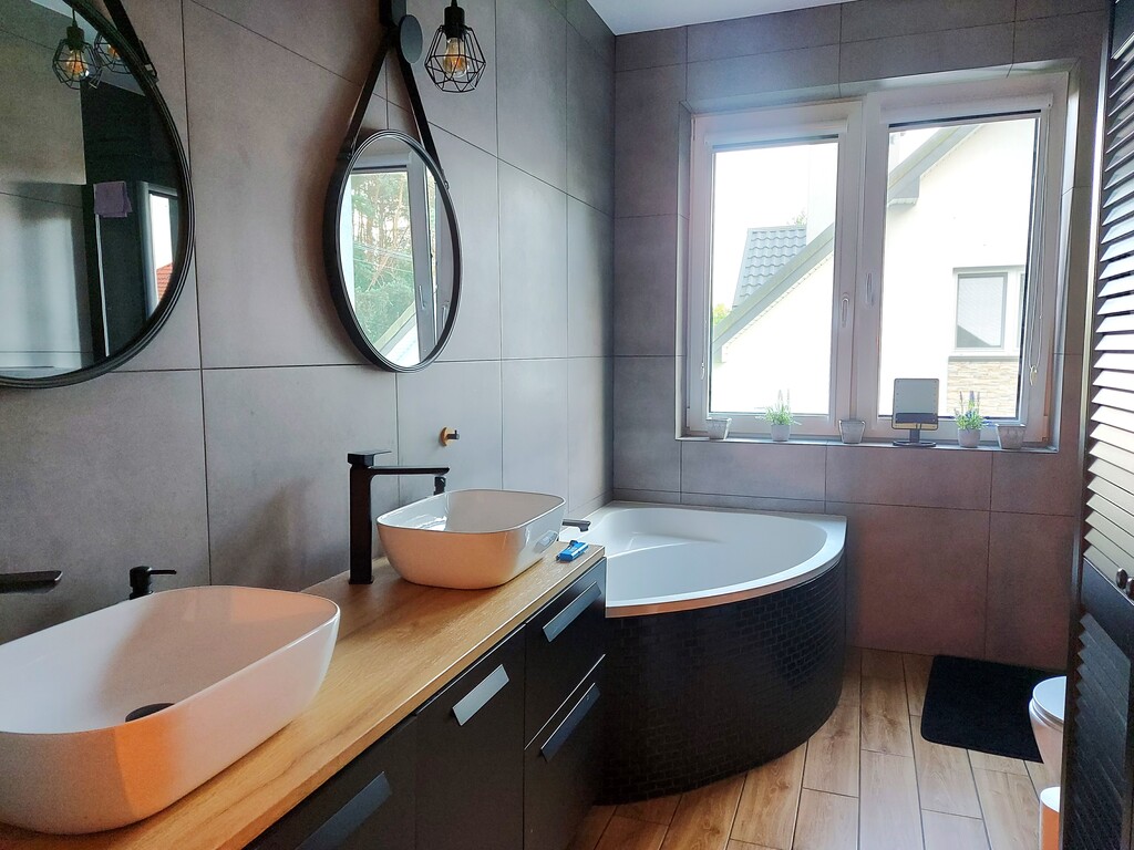 Oczywiście mamy także bardzo ładną dużą łazienkę z wanną, kabiną prysznicową oraz 2 umywalkami. Za ażurowymi drzwiami schowany został piec gazowy i pralka.