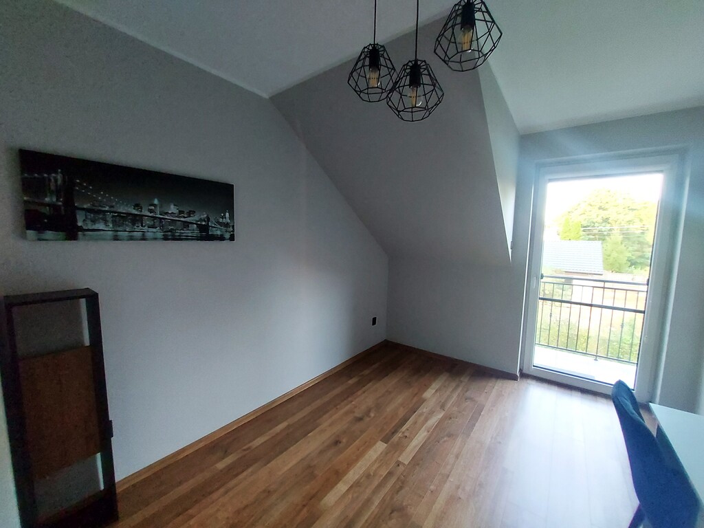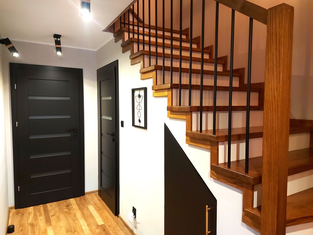 Na piętro wchodzimy pięknymi dębowymi schodami. Są tam 2 sypialnie z wyjściem na balkon oraz duża sypialnia z garderobą.