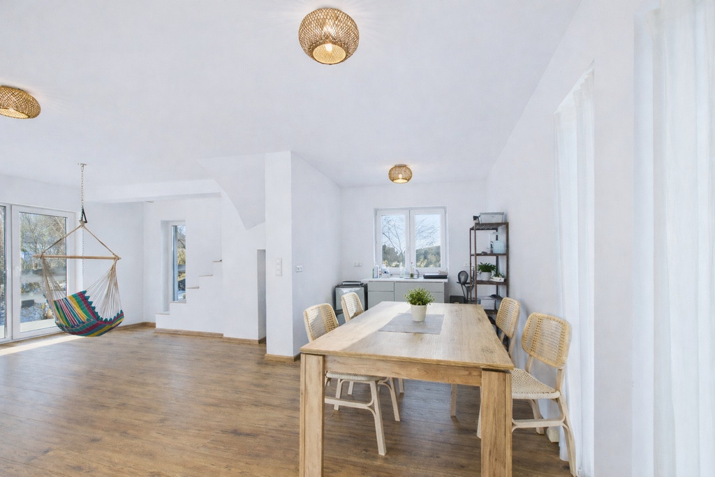 Parter to jasna, otwarta przestrzeń dzienna. Salon z dużymi przeszkleniami i wyjściem na taras płynnie łączy się z częścią jadalnianą oraz kuchnią. Wschodnia ekspozycja zapewnia naturalne poranne światło i przyjemny klimat wnętrza.