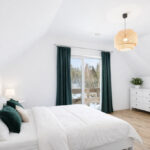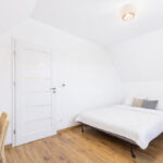 Piętro stanowi część prywatną – sypialnie oraz większa łazienka z wanną. Jedno z pomieszczeń posiada wyjście na balkon, z którego rozciąga się widok na otwartą przestrzeń.