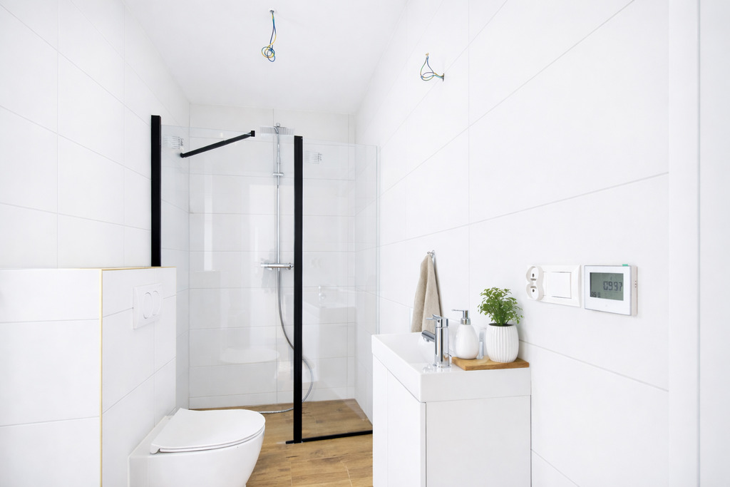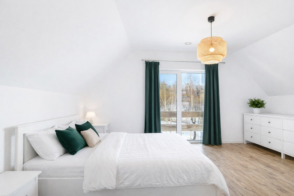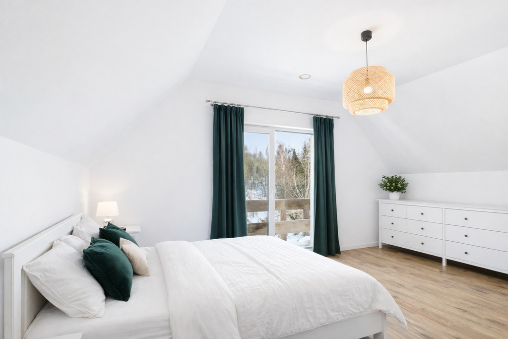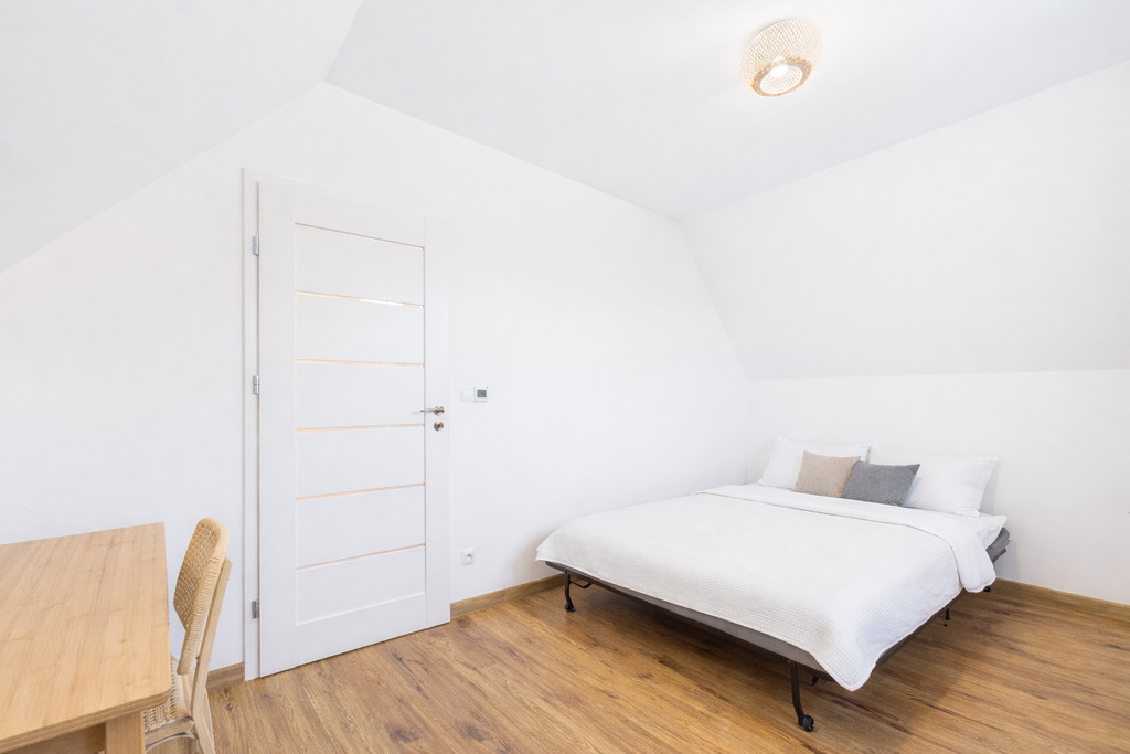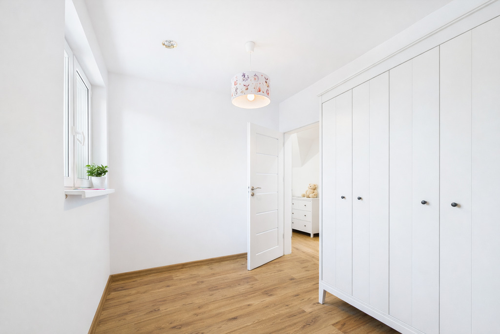 Wnętrza wykończone w jasnej, neutralnej kolorystyce – gotowe do zamieszkania lub personalizacji według własnych potrzeb.