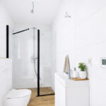 Na tym poziomie znajduje się również łazienka z prysznicem oraz dodatkowe pomieszczenie gospodarcze. Pod schodami zaprojektowano praktyczny schowek – idealny na sprzęt domowy, odkurzacz czy zapasy.