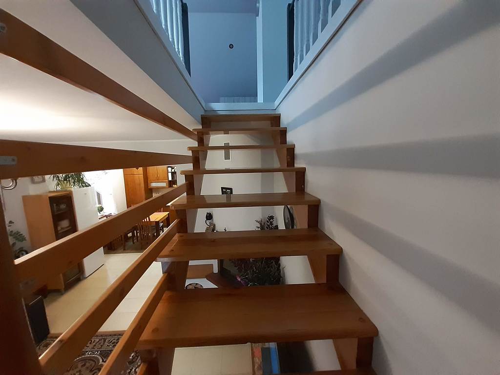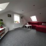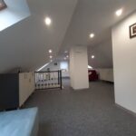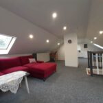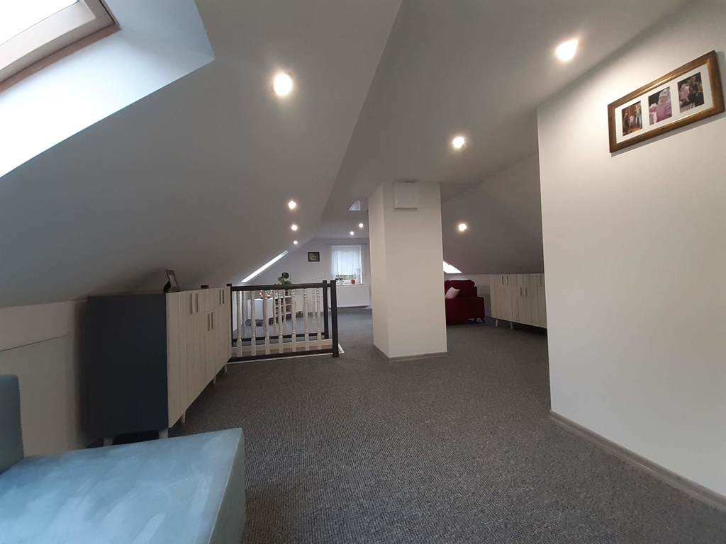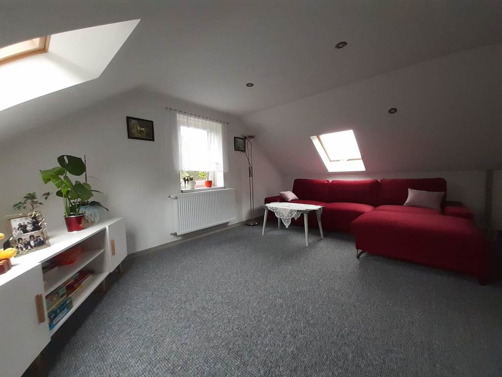 Składa się z 3 pokojów, w tym dużego salonu połączonego z kuchnią, korytarza, łazienki oraz toalety na poddaszu. Powierzchnia parteru ok. 70 m2, poddasza 50 m2.