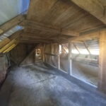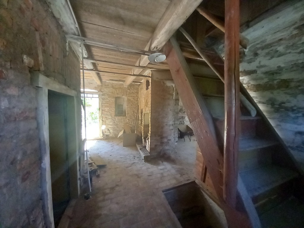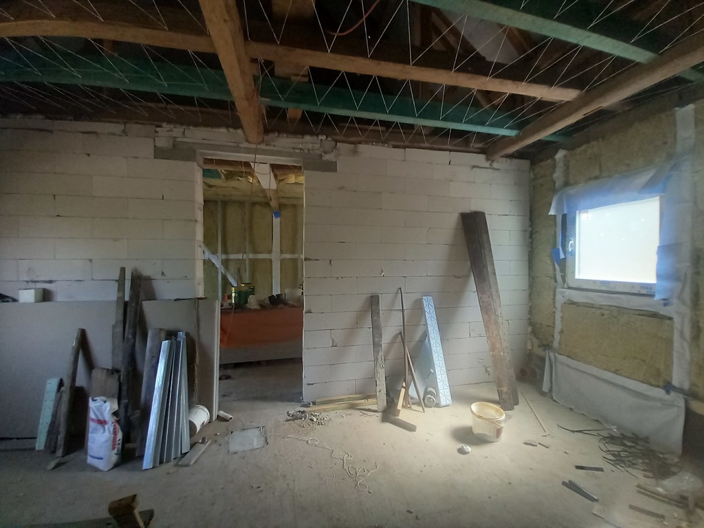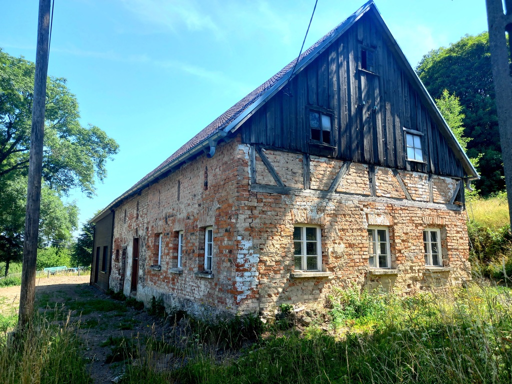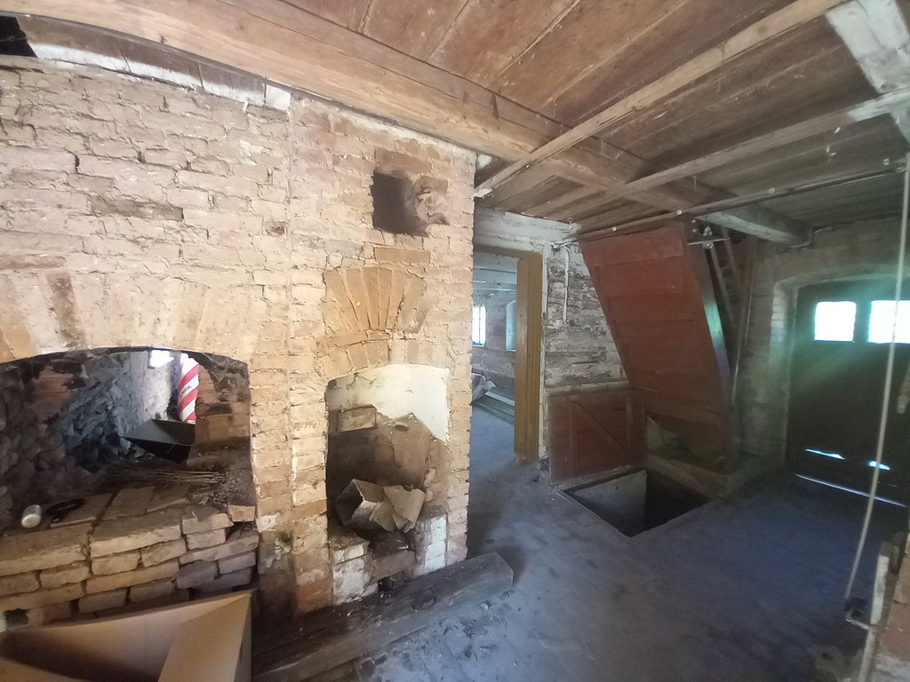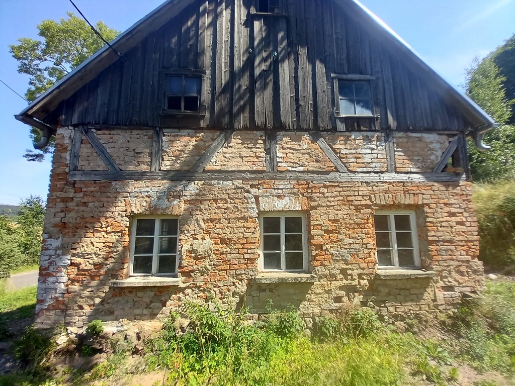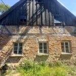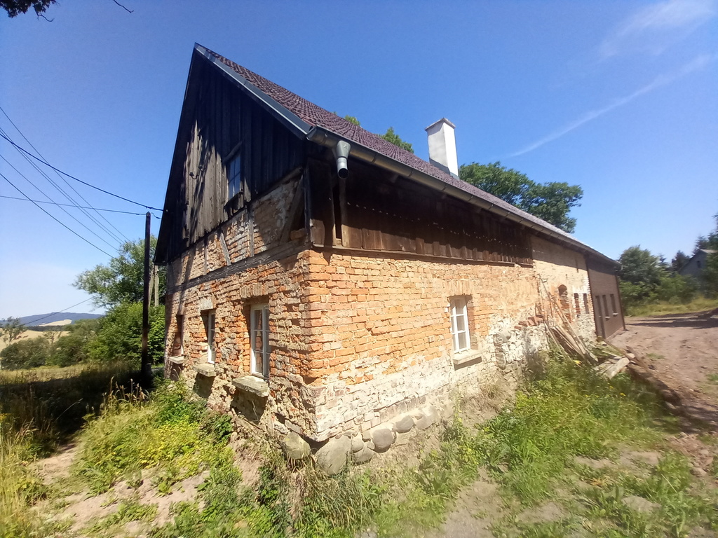 Murowana część domu została oczyszczona ze starych tynków, ma zrobiony dach, sprawdzone drewniane skrzyniowe okna- które idealnie nadają się do renowacji.