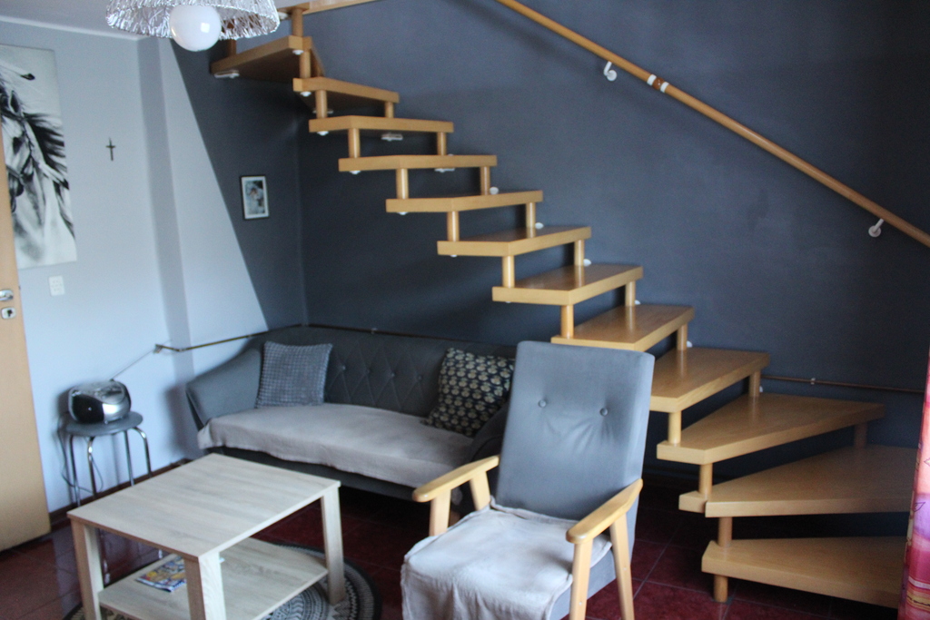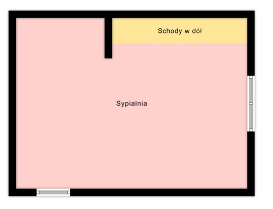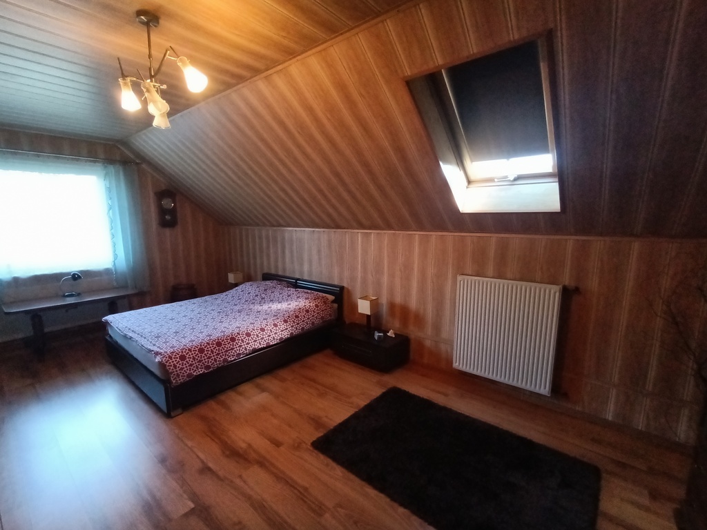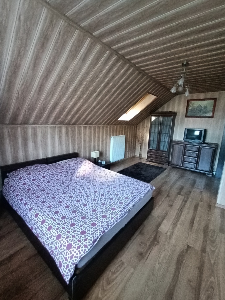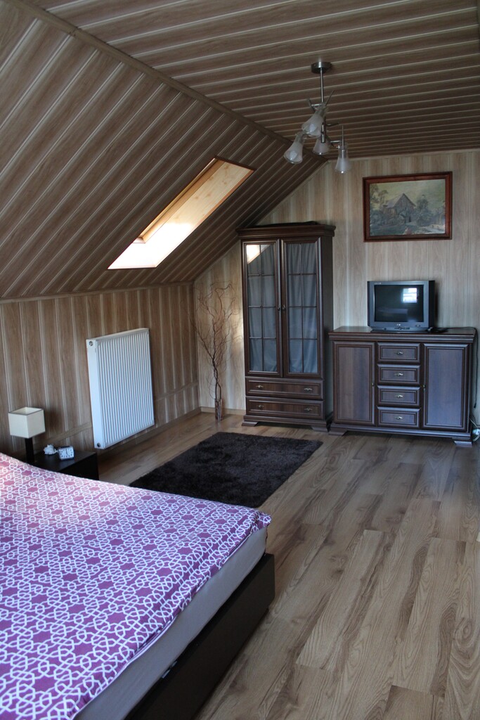 - poddasze użytkowe, które projektowo miało zostać przedzielone na dwa pokoje, jednakże ostatecznie została jedna duża przestrzeń