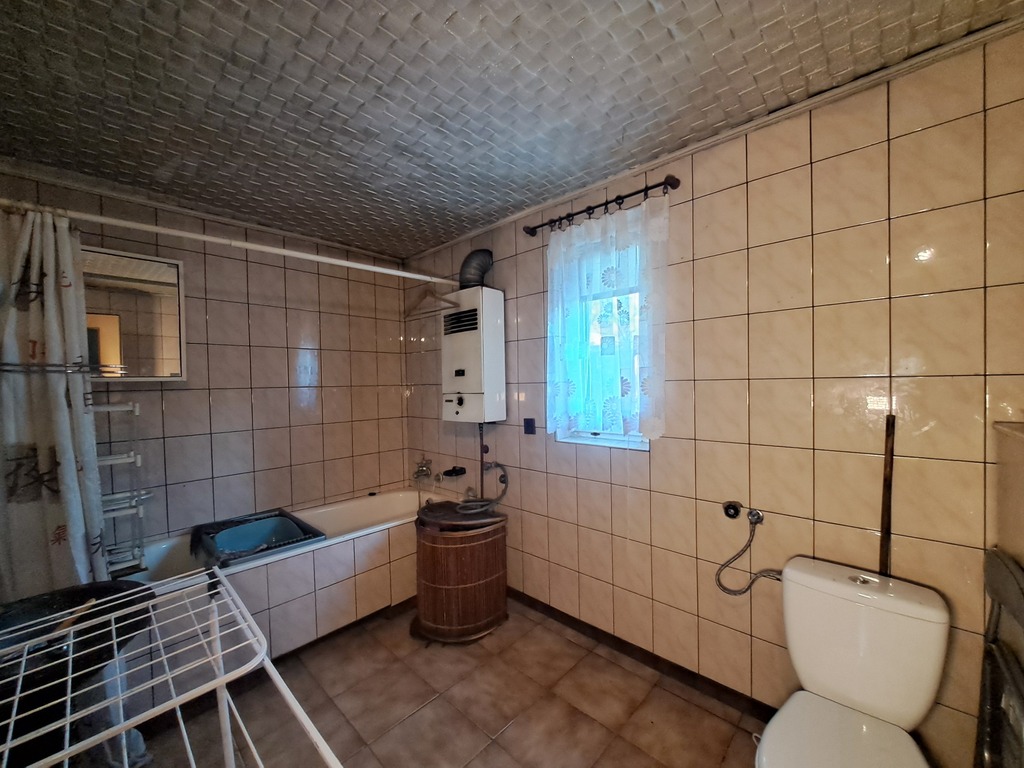 Okna PCV, na dachu ondulina i blacha, ogrzewanie z pieca węglowego z podkową, dodatkowo w łazience piecyk gazowy do podgrzania wody.