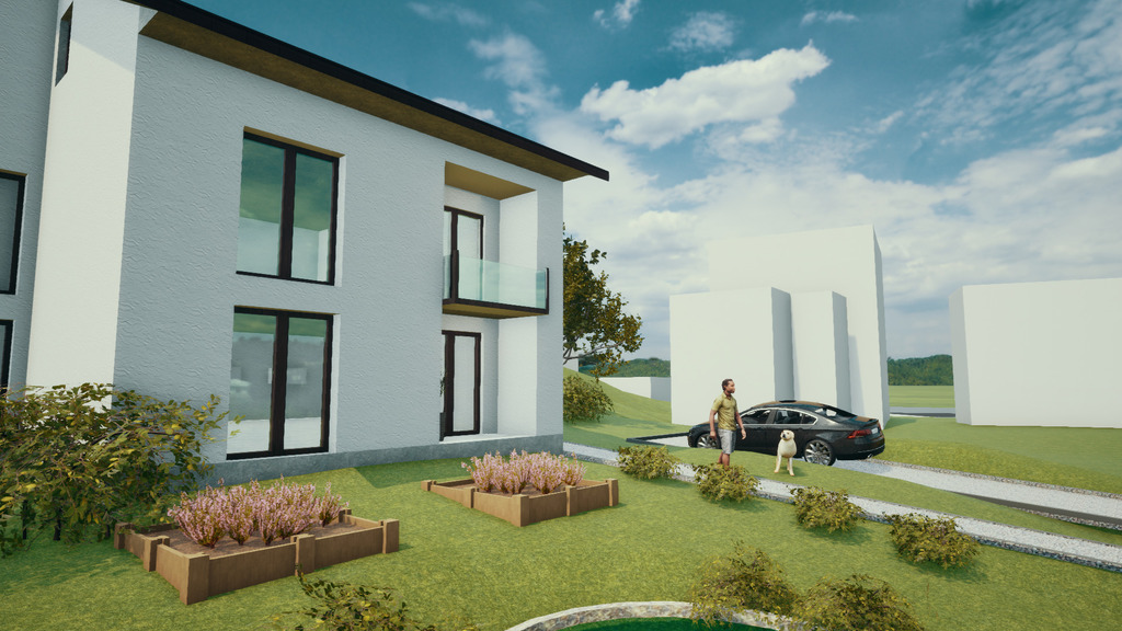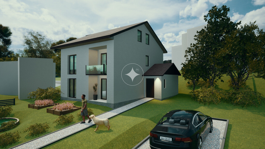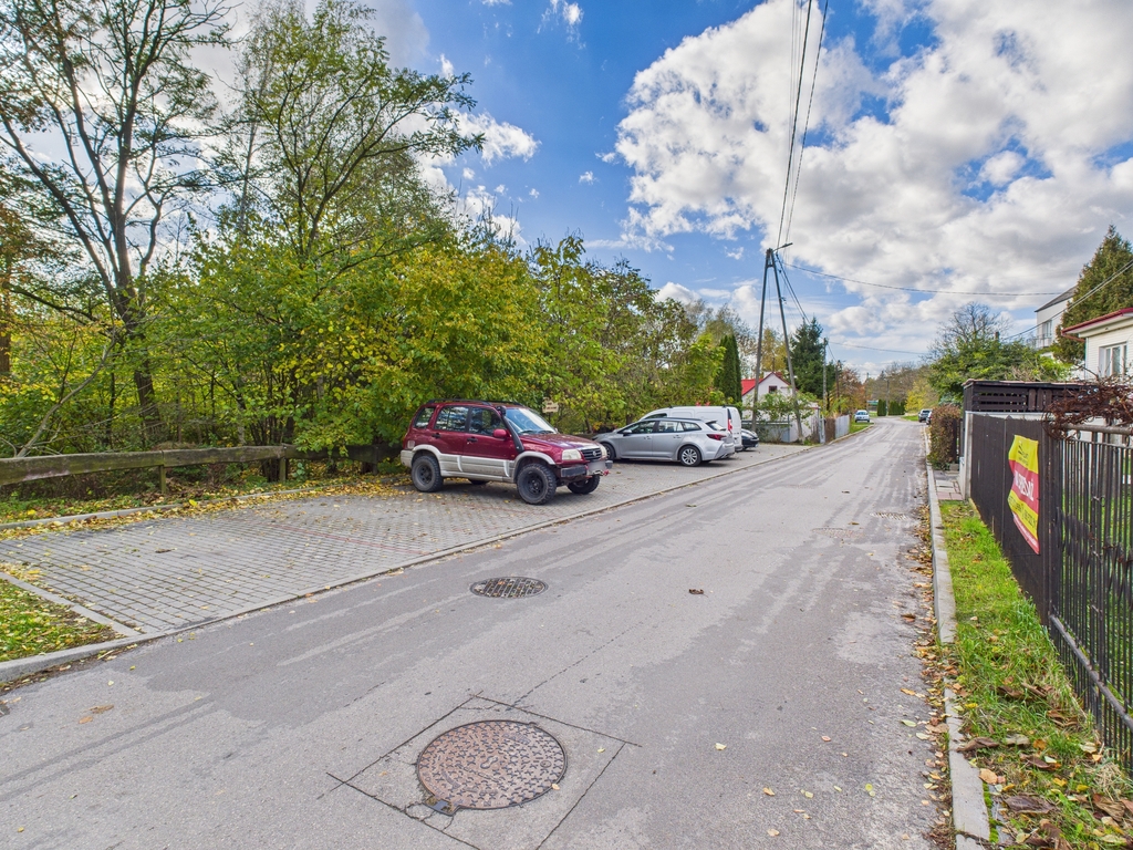 Dość duża działka ok 700 m.kw w kształcie trapezu jest lekko pochylona z wystawą na południowy zachód . Przed domem jest zatoka parkingowa na kilka samochodów co stanowi dodatkową zaletę.