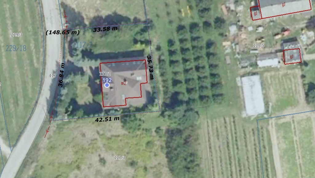 Powierzchnia działki wynosi 1345 m2 a kształt działki zbliżony jest do trapezu .