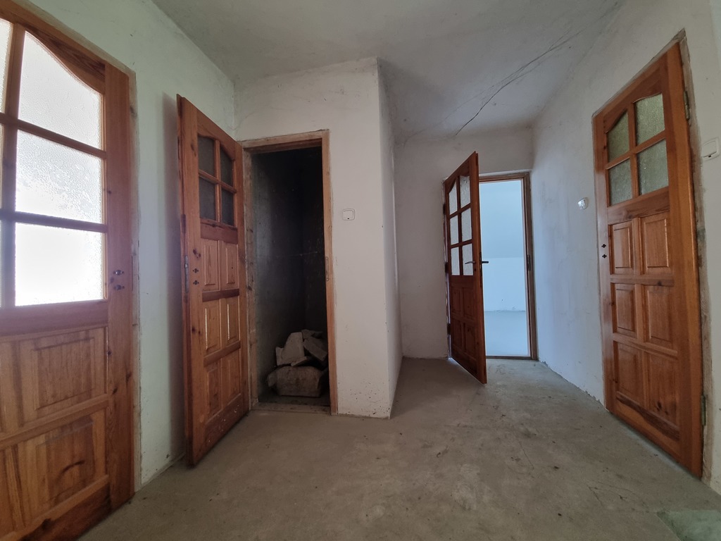 Stolarka okienna drewniana podobnie jak drzwi wewnętrzne i zewnętrzne. Posadzki wykończone betonowe.
