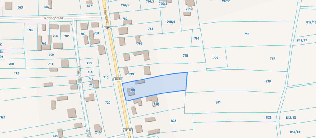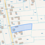 Działka w kształcie prostokąta, ogrodzona, częściowo zabudowana.