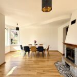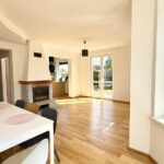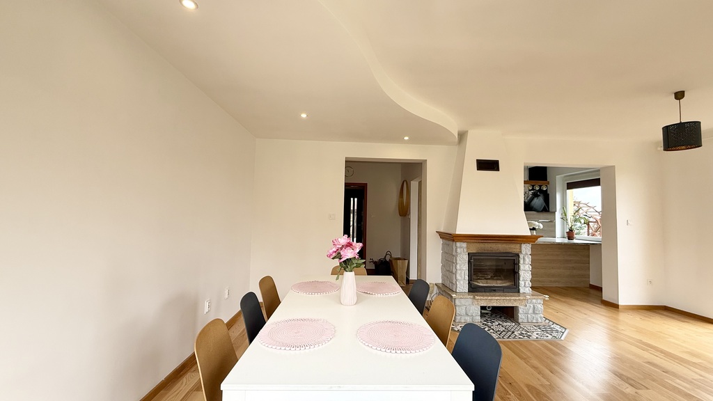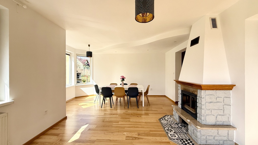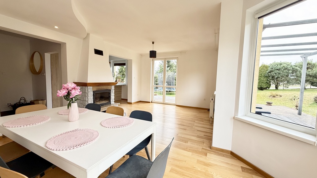 - przytulny salon z kominkiem i wyjściem na taras – idealny na rodzinne spotkania