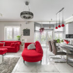 Salon z kominkiem i częścią jadalnianą (34,04m2) z wyjściem na taras przez duże dwuskrzydłowe drzwi