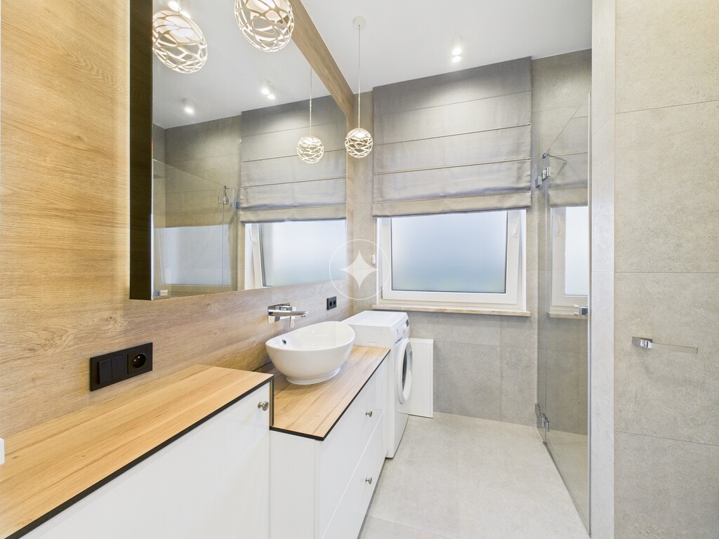 Pomieszczenia są klimatyzowane, posiada ogrzewanie podłogowe. Meble zostały wykonane na zamówienie, w zabudowie pod wymiar. Cały sprzęt jak i materiały użyte do wykończenia są najwyższej jakości.