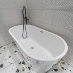 Łazienki - w stylu nowoczesnym - na piętrze - wyposażona w wolnostojącą wannę, elegancka z dwiema umywalkami i drewnianym naturalnym blatem. Na parterze - funkcjonalna z prysznicem i niezwykłą jodełkową ścianą. W każdej znajduje się WC.