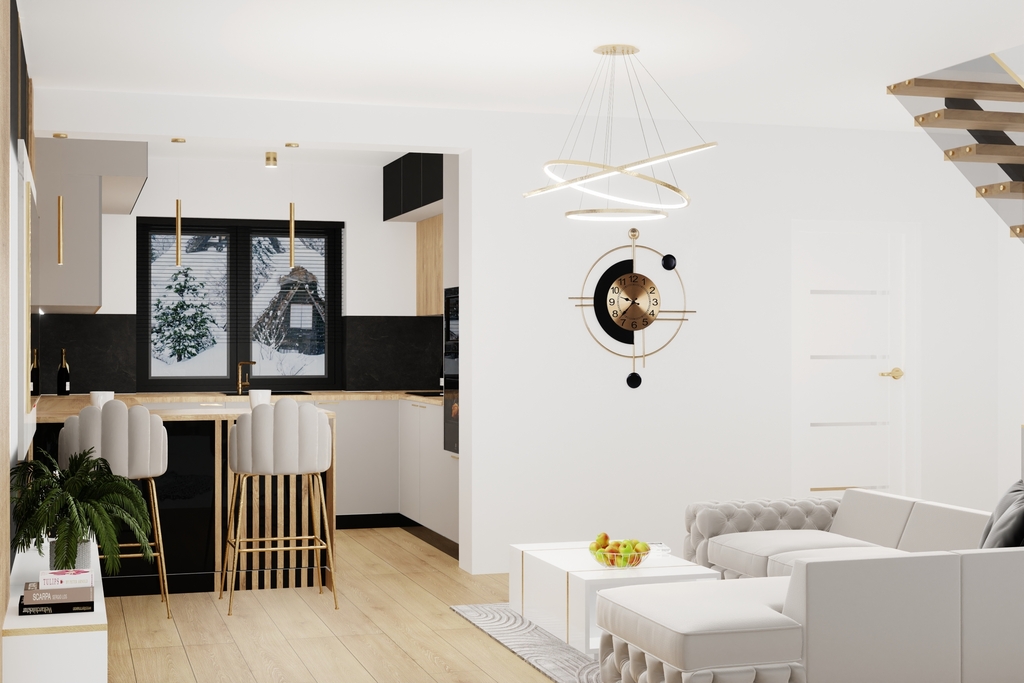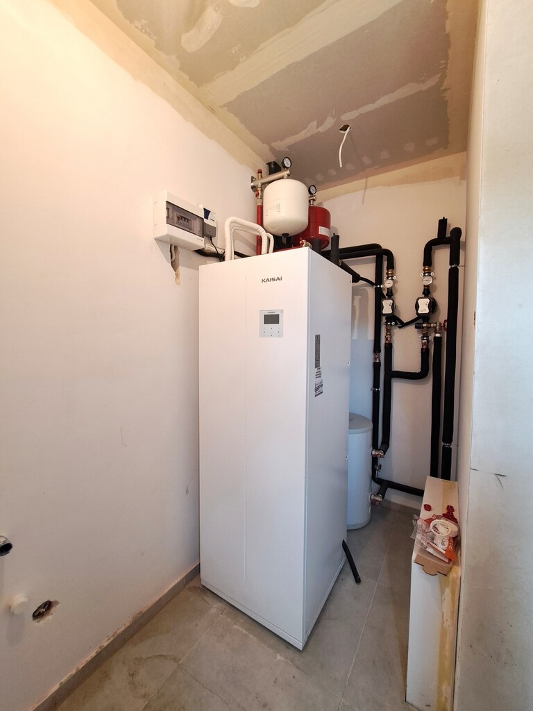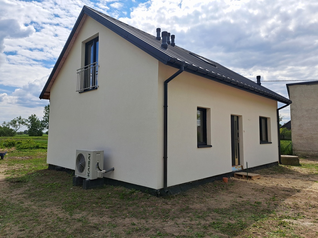 • na parterze znajduje się: salon, kuchnia, pokój, wiatrołap, łazienka, pomieszczenie gospodarcze w którym znajduje się pompa ciepła zapewniająca ogrzewanie i ciepłą wodę