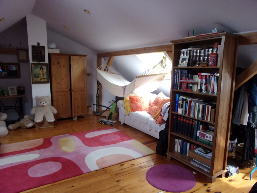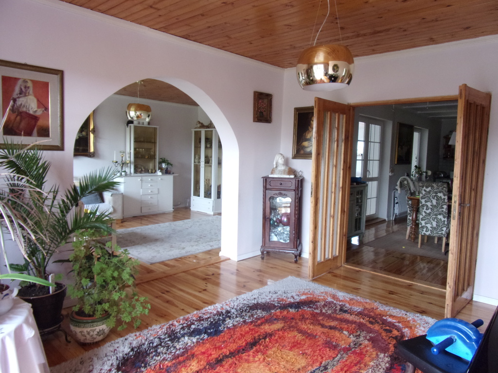 Na parterze mieści się kuchnia z jadalnią, pokój, łazienka, mały salon z kominkiem i wejściem na piętro.