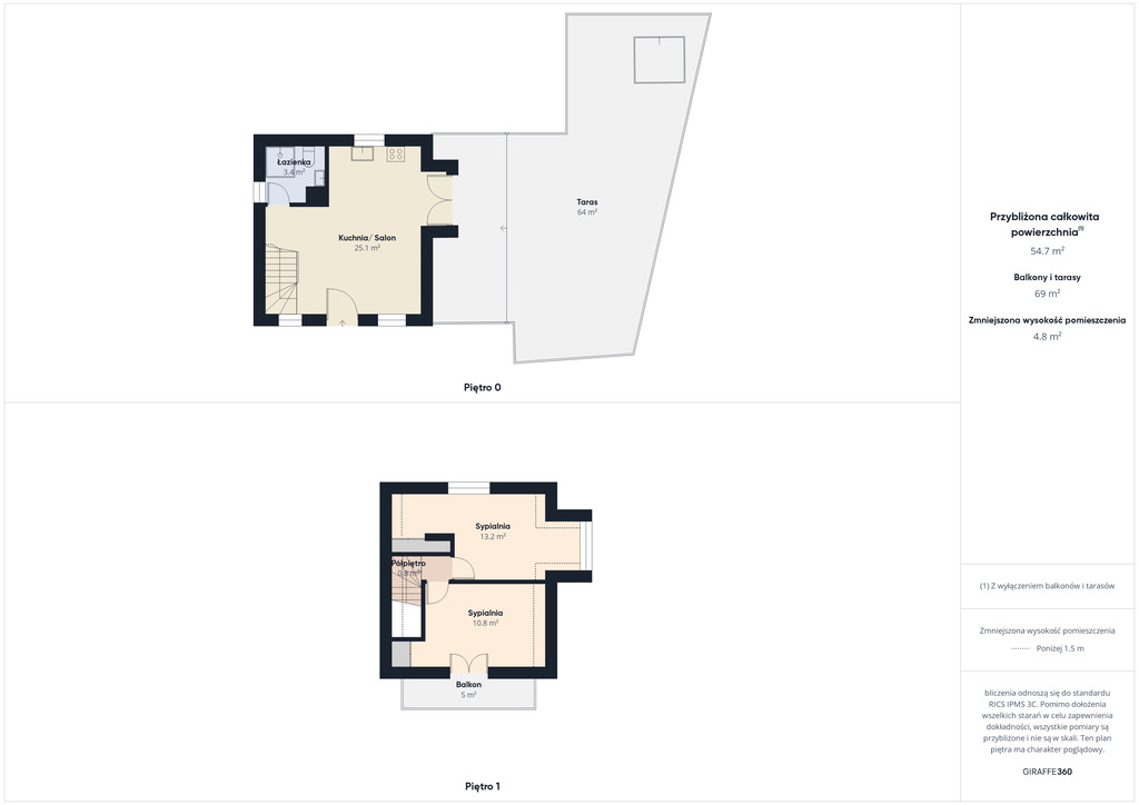 - powierzchnia całkowita: 55 m² (ok. 50 m² powierzchni użytkowej),