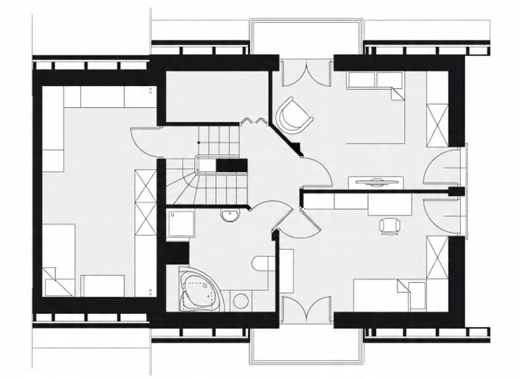 Projekt zapewnia bardzo dobre doświetlenie wnętrz oraz wyraźny podział na strefę dzienną i prywatną.