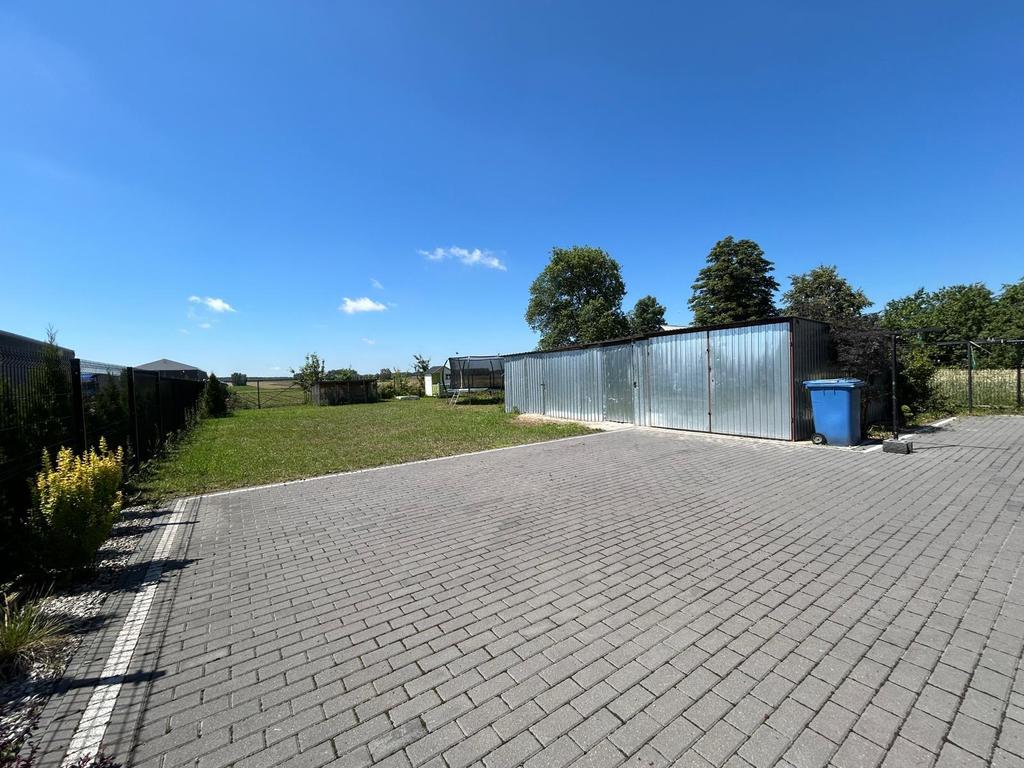 Działka ogrodzona, częściowo wyłożona kostką brukową, na której znajduje się wolnostojący blaszany garaż. W dalszej części znajduje się oddzielona bramą część rolna z ogrodem warzywnym.