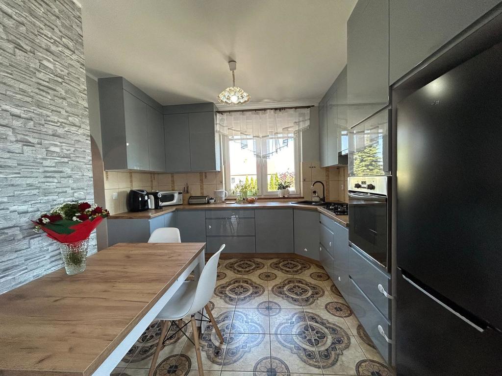 * Kuchnia jest w pełni umeblowana i otwarta, co sprzyja wspólnemu spędzaniu czasu. Przestrzeń między kuchnią i salonem daje możliwość wydzielenia jadalni.