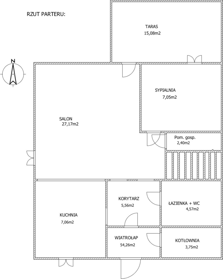 Parter: Salon z dużym tarasem, otwarta i widna kuchnia, sypialnia, łazienka, pomieszczenie gospodarcze, wiatrołap, korytarz z klatką schodową prowadzącą na