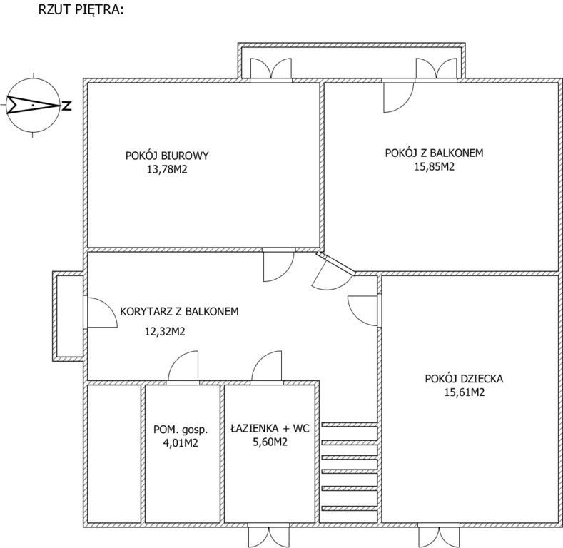 Piętro: pokój dziecka, pokój biurowy, pokój z balkonem, łazienka, pomieszczenie gospodarcze i przestronny korytarz z balkonem.