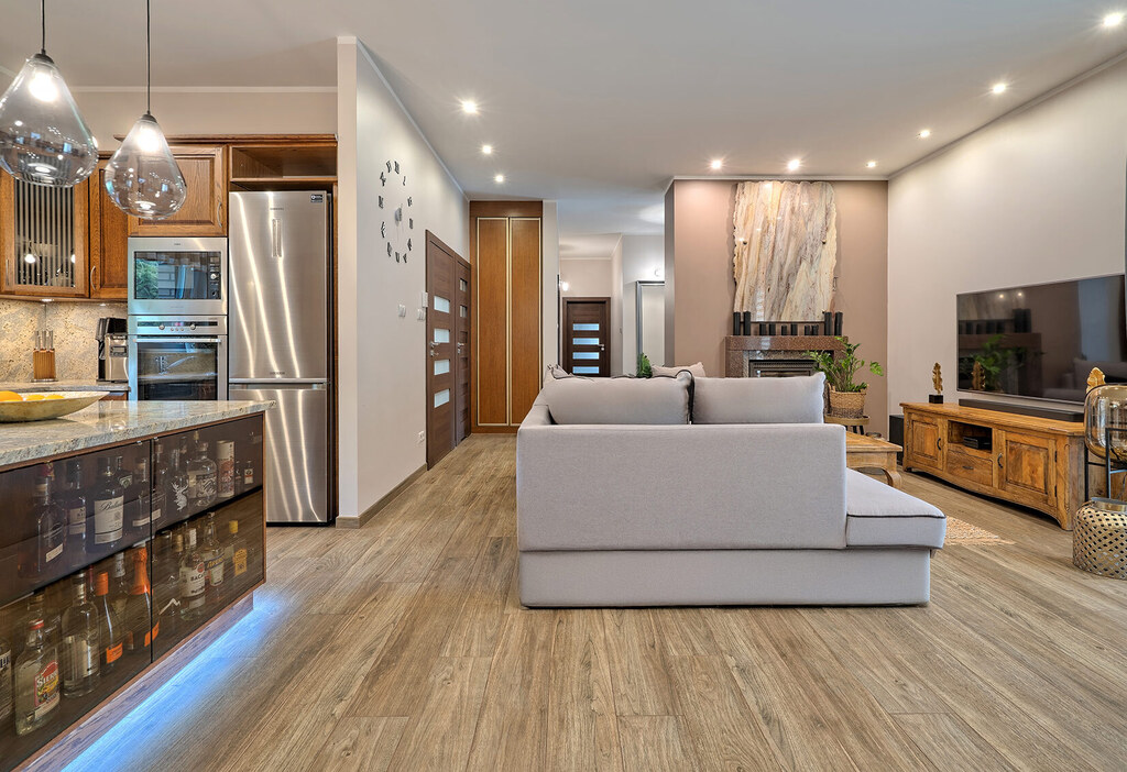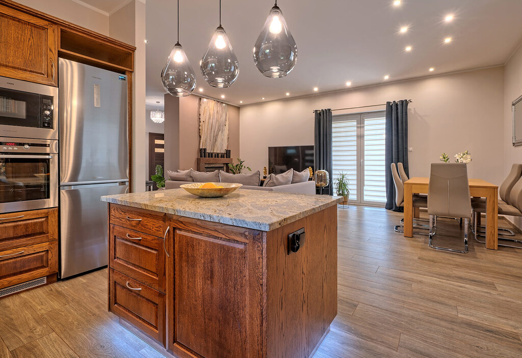 - przestronny salon z kominkiem oraz otwartą, jasną w pełni wyposażoną kuchnią (41 m2)