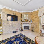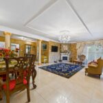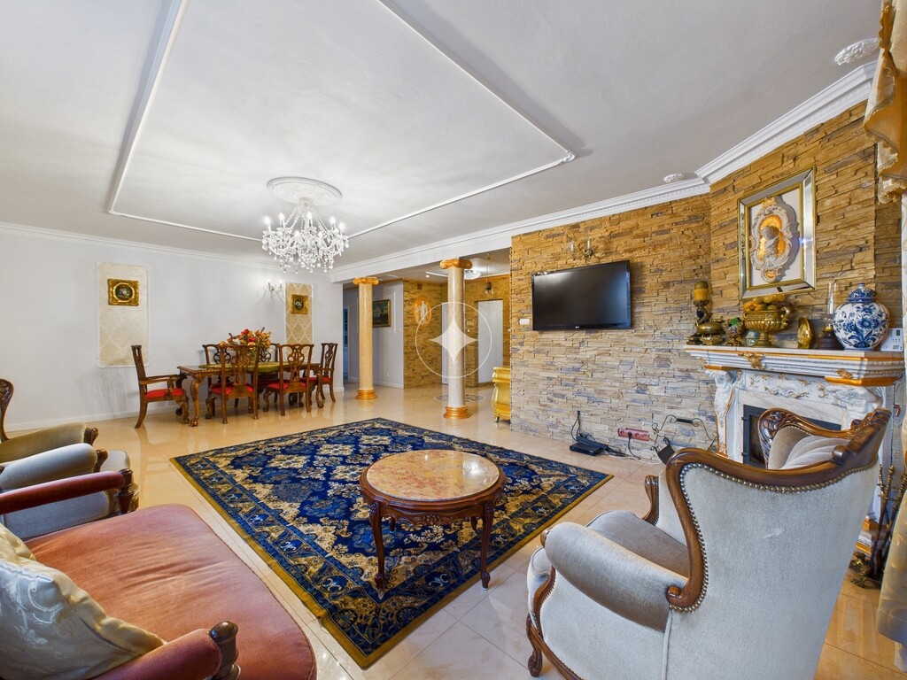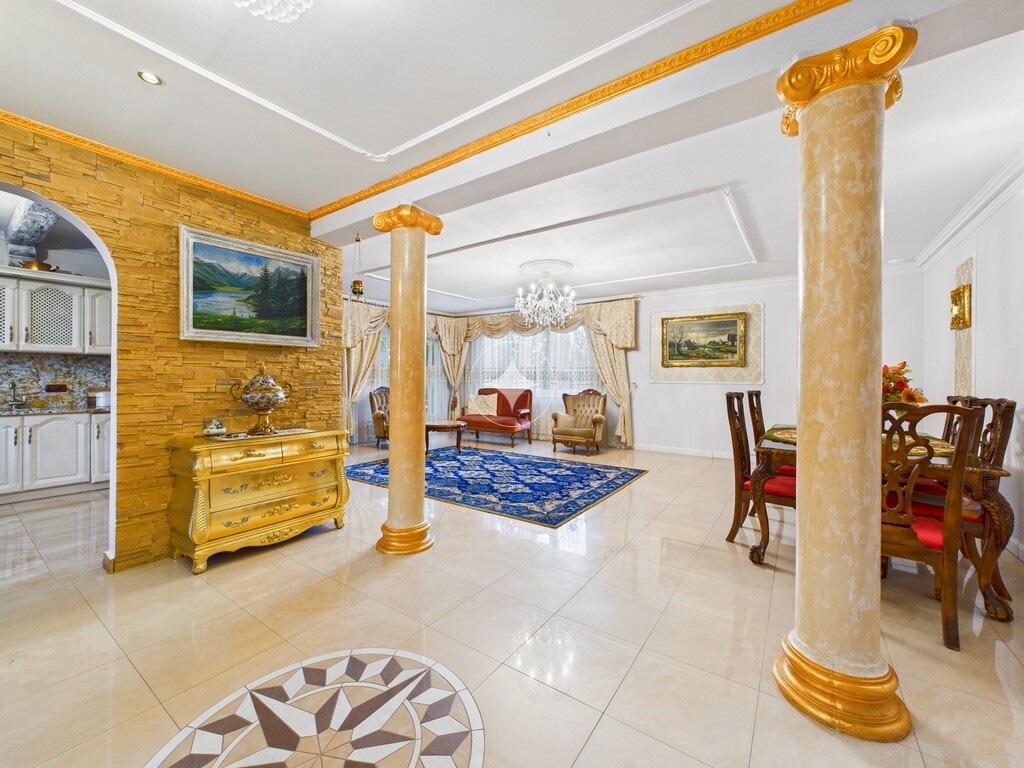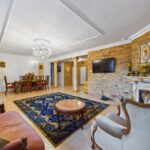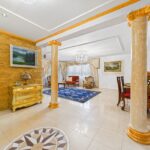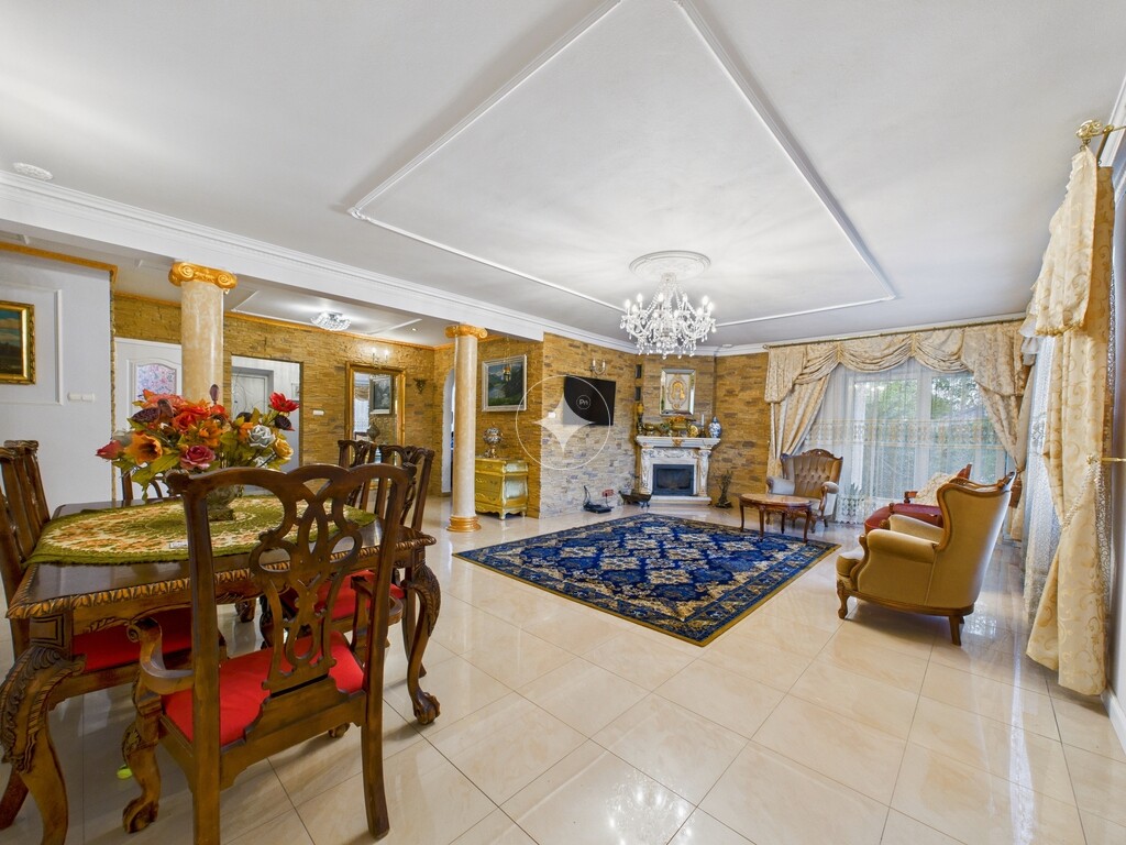 • przestronny salon  o powierzchni 53,9 m2 - z kominkiem, wykończony w stylu królewskim ze stiukowymi kolumnami i gresową podłogą,