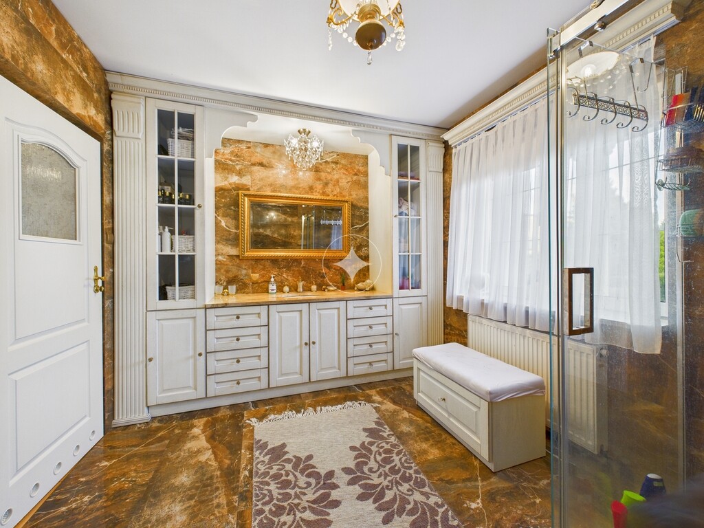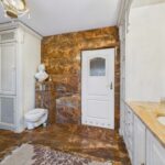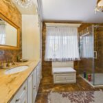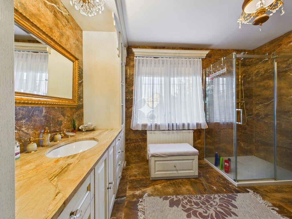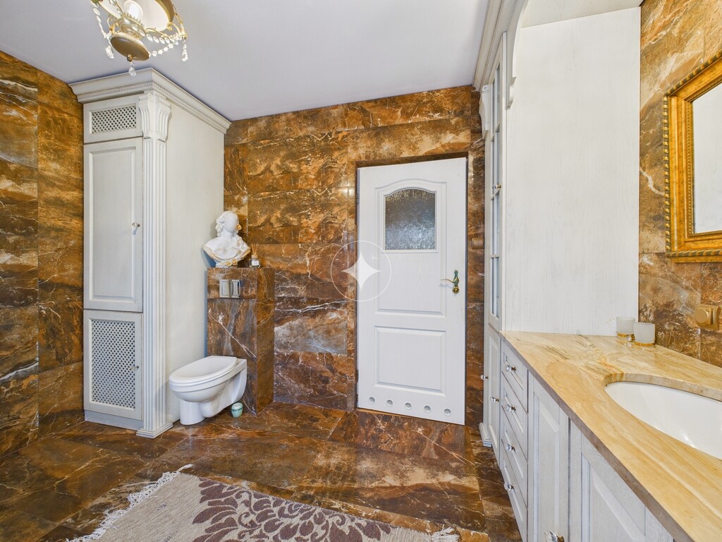 • wytworna łazienka z marmurowym wykończeniem, prysznicem, toaletą, oryginalną umywalką i lustrem oraz pięknym oświetleniem,