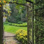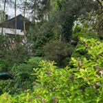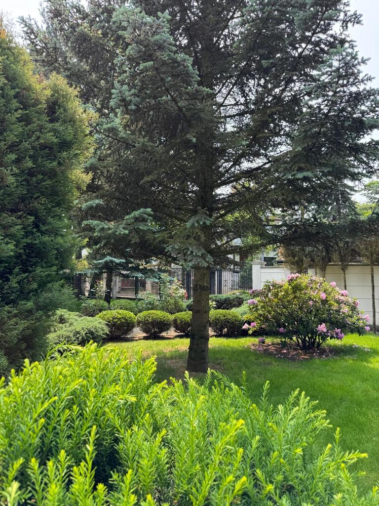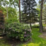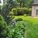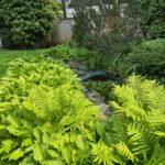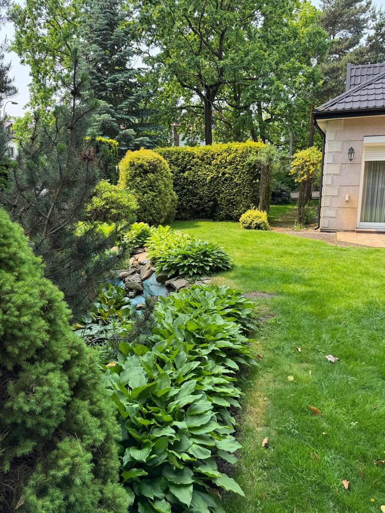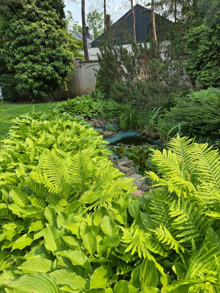 Piękny, zadbany ogród z oczkiem wodnym, porośnięty bujną roślinnością, krzewami ozdobnymi oraz drzewami.