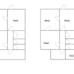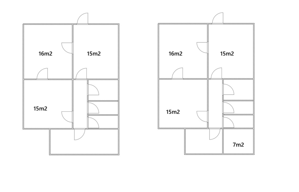 - Piętro: 3 pokoje(15m2, 16m2, 7m2), łazienka, korytarz z wejściem na balkon, wyjście na strych, kuchnia (15m) i którą w łatwy sposób można przekształcić na pokój z wyjściem na taras.