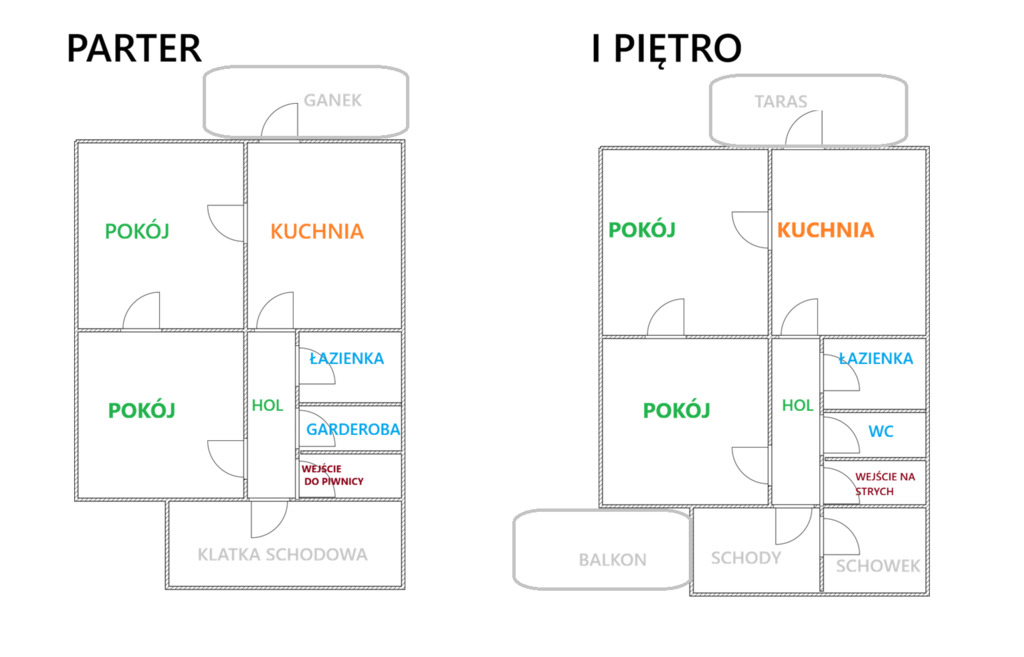 - Parter: 2 pokoje (15m2, 16m2) , kuchnia (15m2) z niezależnym wyjściem/wejściem przez ganek , łazienka, korytarz, garderoba, zejście do piwnicy.