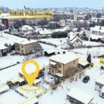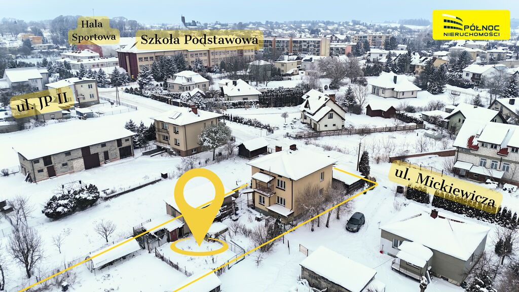 Dom znajduje się przy spokojnej ulicy z chodnikami i oświetleniem ulicznym. Położony jest przy Szkole Podstawowej, w sąsiedztwie zabudowań jednorodzinnych, punktów usługowych, marketu i przychodni zdrowia. Nieopodal znajdziemy też przedszkole, boiska, plac zabaw, park, Dom Kultury i Urząd Gminy.