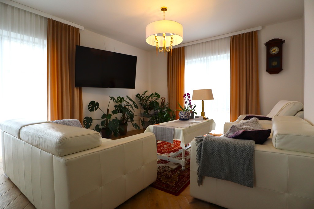 Neutralne, stonowane kolory i nowoczesny styl sprawiają, że wnętrza idealnie wpisują się w obecne trendy, tworząc przyjemną atmosferę do życia.