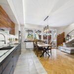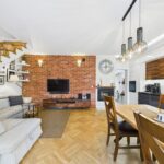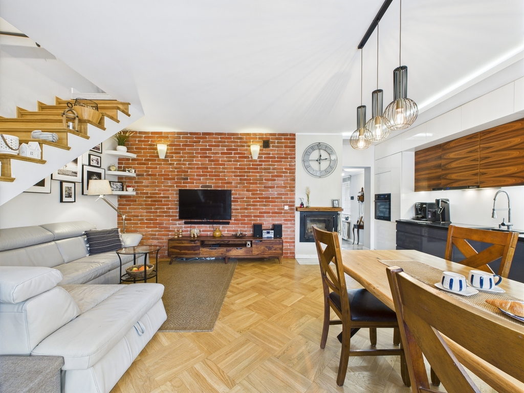- Drewniane wykończenia – eleganckie schody i parkiet dębowy,
