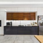 - nowoczesna kuchnia z zabudową na wymiar w odcieniach grafitu, bieli i drewna – blat oraz zlew ze staronu (trwały konglomerat),