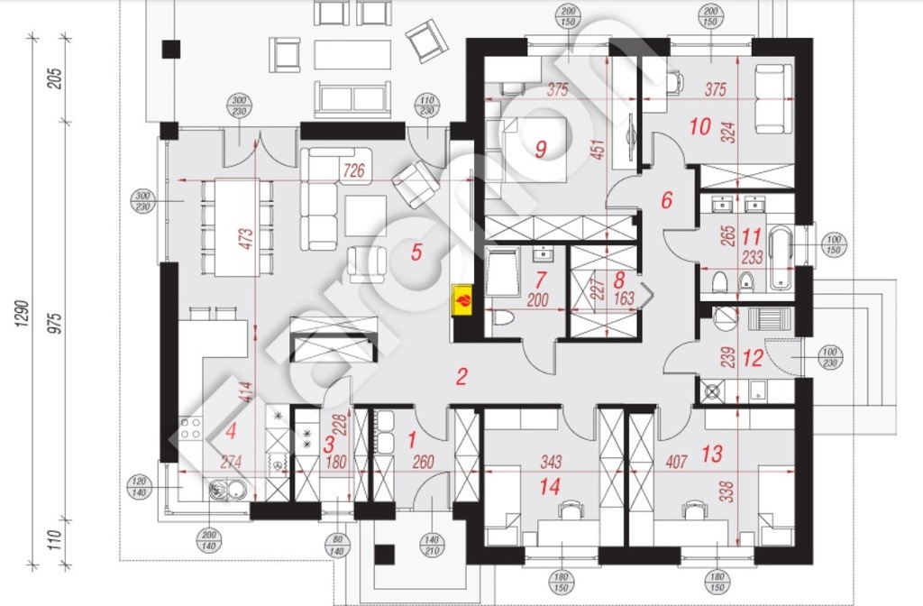 Układ pomieszczeń (projekt Dom w Alwach 3): - przestronny salon z jadalnią i wyjściem na taras