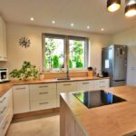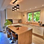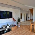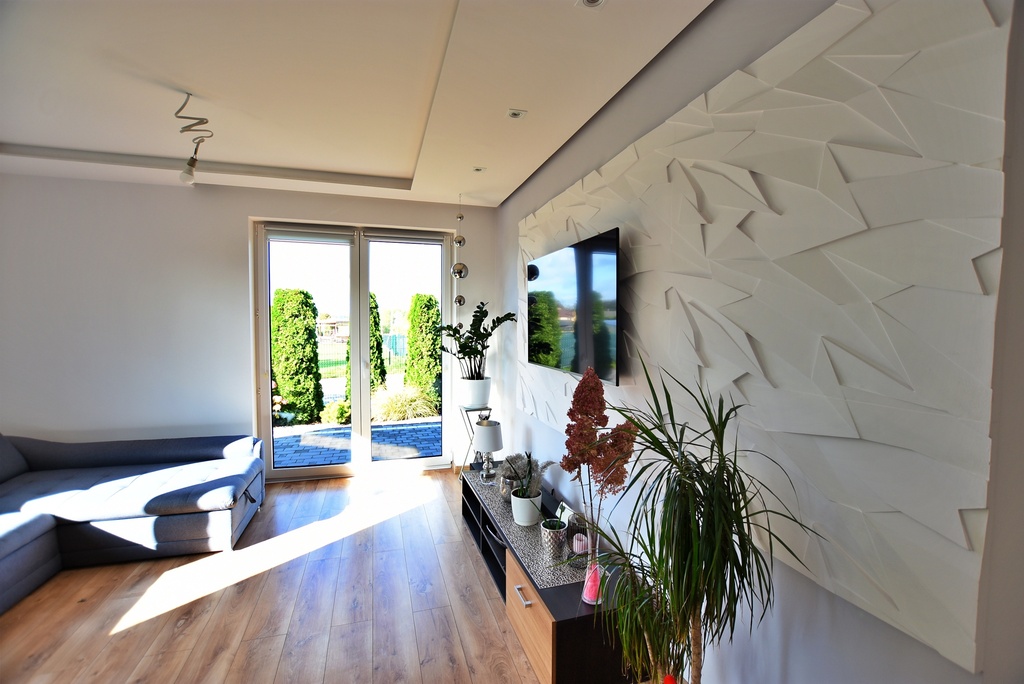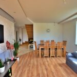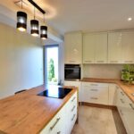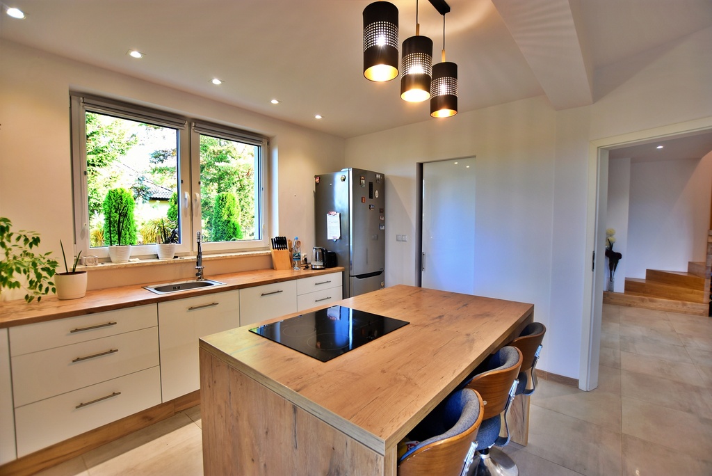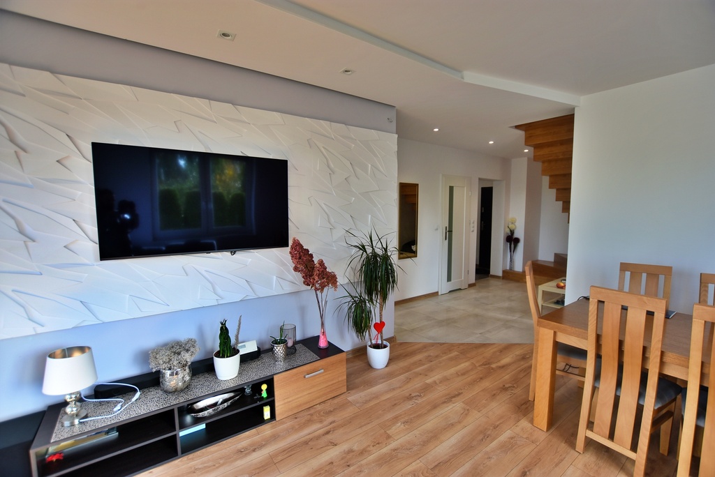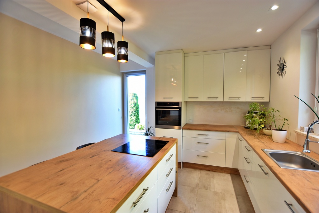 - Między kuchnią a salonem zastosowana ściana, która pozwala na połączenie tych dwóch pomieszczeń tworząc salon z aneksem kuchennym.